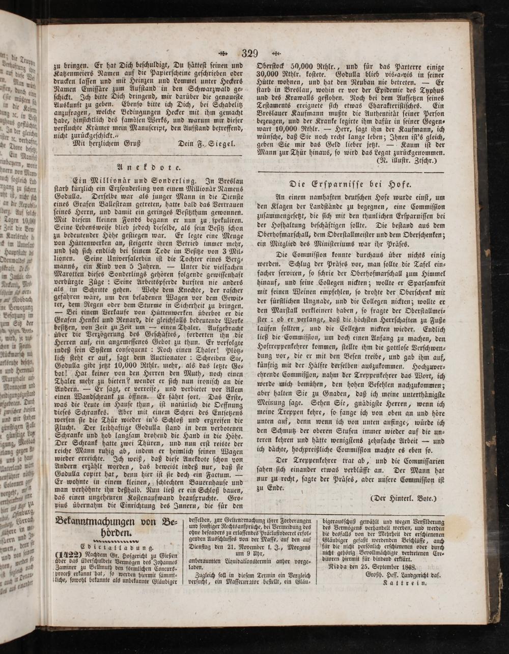 Ein Millionär und Sonderling. In Breslau ſtarb kürzlich ein Erzſonderling von einem Millionaͤr Namens Godulla. Derſelbe war als junger Mann in die Dienſte eines Grafen Balleſtram getreten, hatte bald das Vertrauen ſeines Herrn, und damit ein geringes Beſitzthum gewonnen. Mit dieſem kleinen Fonds begann er nun zu ſpekuliren. Seine Lebensweiſe blieb jedoch dieſelbe, als ſein Beſitz ſchon zu bedeutender Höhe geſtiegen war. Er legte eine Menge von Hüttenwerken an, ſteigerte ihren Betrieb immer mehr, und ſah ſich endlich bei ſeinem Tode im Beſitze von 3 Mil- lionen. Seine Univerſalerbin iſt die Tochter eines Berg— manns, ein Kind von 5 Jahren.— Unter die vielfachen Marotten dieſes Sonderlings gehören folgende gewiſſenhaft verbürgte Zuge: Seine Arbeitspferde durften nie anders als im Schritte gehen. Wehe dem Knechte, der raſcher gefahren wäre, um den beladenen Wagen vor dem Gewit— ter, dem Regen oder dem Sturme in Sicherheit zu bringen. — Bei einem Verkaufe von Hüttenwerken überbot er die Grafen Henkel und Renard, die gleichfalls bedeutende Werke beſitzen, von Zeit zu Zeit um— einen Thaler. Aufgebracht uber die Verzögerung des Geſchäftes, forderten ihn die Herren auf, ein angemeſſenes Gebot zu thun. Er verfolgte indeß ſein Syſtem conſequent: Noch einen Thaler! Ploͤtz— lich ſteht er auf, ſagt dem Auctionator: Schreiben Sie, Godulla gibt jetzt 10,000 Rthlr. mehr, als das letzte Ge— bot! Hat keiner von den Herren den Muth, noch einen Thaler mehr zu bieten? wendet er ſich nun ironiſch an die Andern.— Er ſagt, er verreiſe, und verbietet vor Allem einen Wandſchrank zu öffnen. Er fährt fort. Das Erſte, was die Leute im Hauſe thun, iſt natürlich die Oeffnung dieſes Schrankes. Aber mit einem Schrei des Entſetzens werfen ſie die Thür wieder in's Schloß und ergreifen die Flucht. Der leibhaftige Godulla ſtand in dem verbotenen