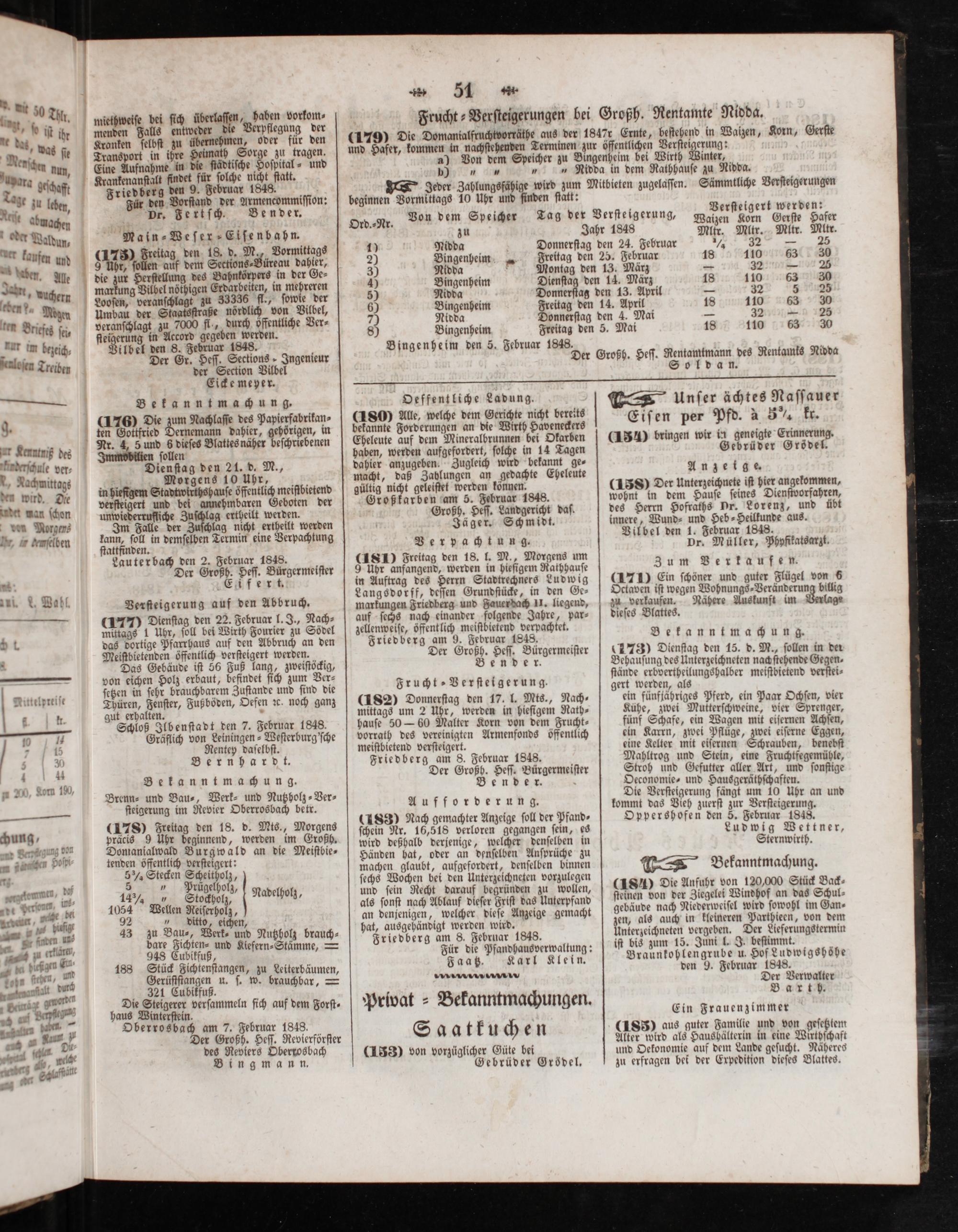 (180) Alle, welche dem Gerichte nicht bereits bekannte Forderungen an die Wirth Haveneckers Eheleute auf dem Mineralbrunnen bei Okarben haben, werden aufgefordert, ſolche in 14 Tagen dahier anzugeben. Zugleich wird bekannt ge⸗ macht, daß Zablungen an gedachte Eheleute gültig nicht geleiſtet werden können. Großkarben am 5. Februar 1848. Großh. Heſſ. Landgericht daſ. Jäger. Schmidt. Verpachtung. (1810 Freitag den 18. 1. M., Morgens um 9 Uhr anfangend, werden in hieſigem Rathhauſe in Auftrag des Herrn Stadtrechners Ludwig Langsdorff, deſſen Grundſtücke, in den Ge⸗ markungen Friedberg und Fauerdach II. liegend, auf ſechs nach einander folgende Jahre, par⸗ zellenweiſe, öffentlich meiſtbietend verpachtet. Friedberg am 9. Februar 1848. Der Großh. Heſſ. Bürgermeiſter Bender.