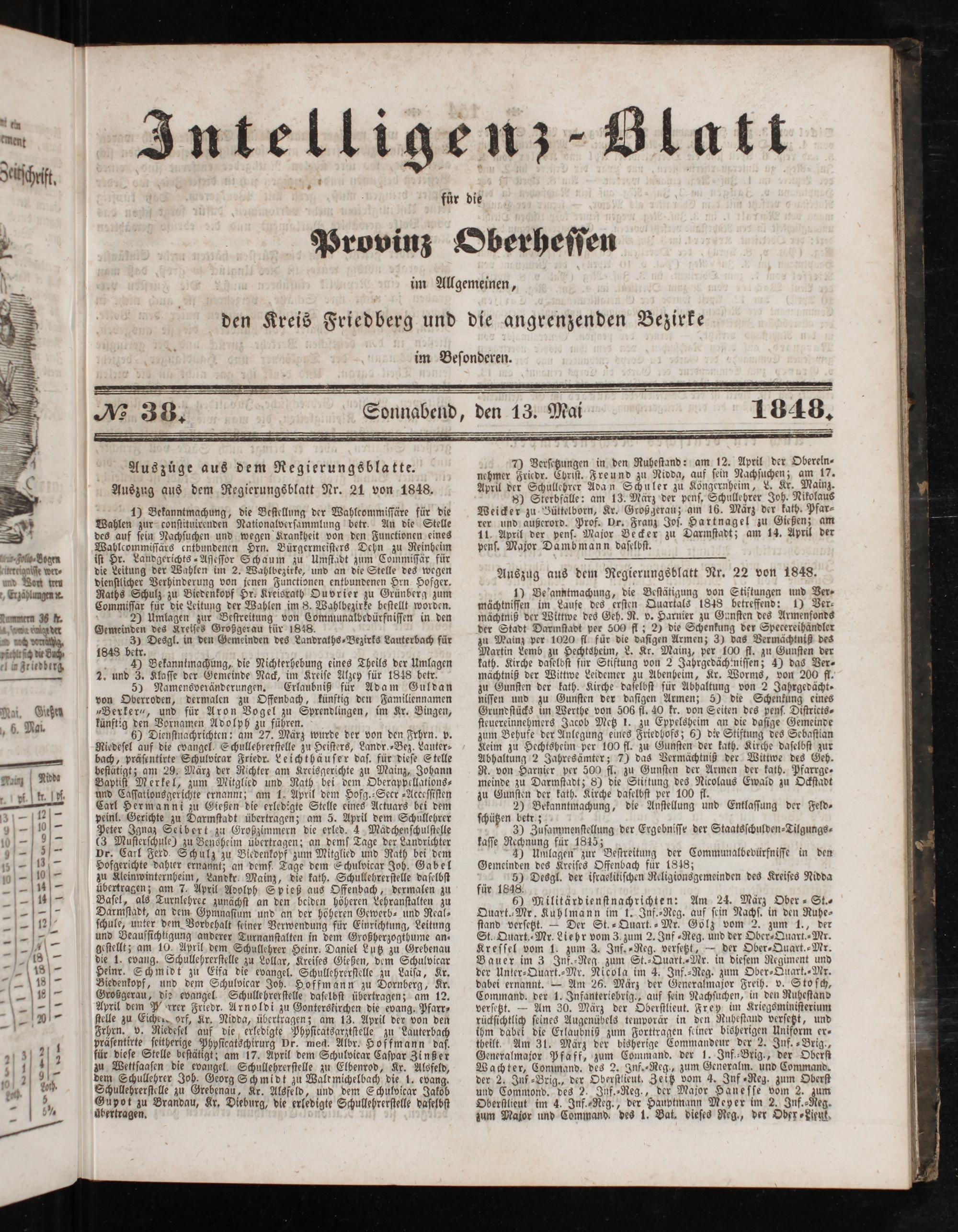 Commiſſar für die Leitung der Wahlen im 8. Wahlbezirke beſtellt worden. 2) Umlagen zur Beſtreitung von Communalbedürfniſſen in den Gemeinden des Kreiſes Großgerau für 1848. 3) Desgl. in den Gemeinden des Landraths⸗Bezirks Lauterbach für 1848 betr. 4) Bekanntmachung, die Nichterhebung eines Theils der Umlagen 2. und 3. Klaſſe der Gemeinde Nack, im Kreiſe Alzey für 1848 betr. 5) Namensveränderungen. Erlaubniß für Adam Guldan von Oberroden, dermalen zu Offenbach, künftig den Familiennamen