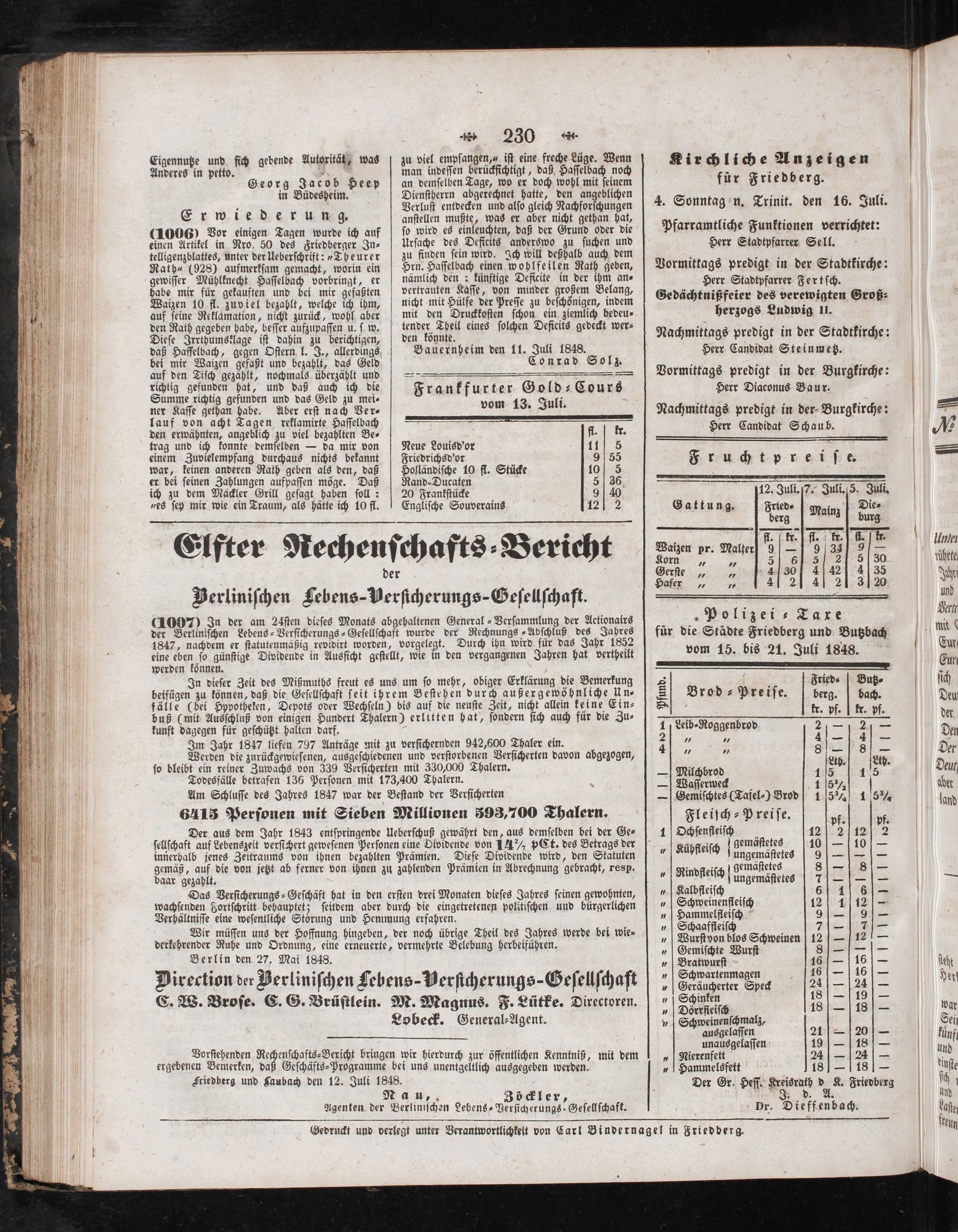 Friedberg und Jaubach den 12. Juli 1848. Na u, Zöckler, Agenten der Berliniſchen Lebens-Verſicherungs⸗Geſellſchaft.