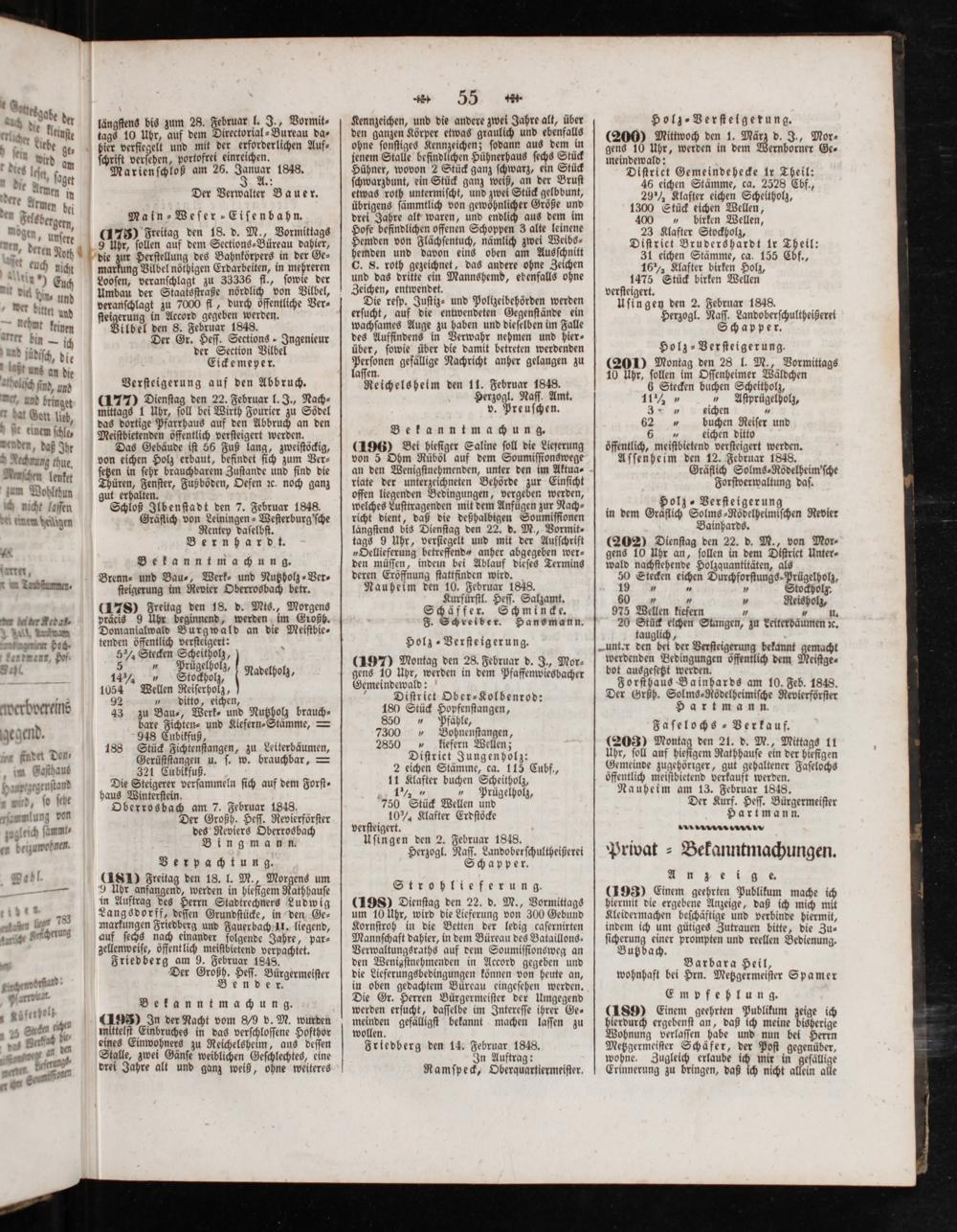 (196) Bei hieſiger Saline ſoll die Lieferung von 5 Ohm Rüböl auf dem Soumiſſionswege an den Wenigſtnehmenden, unter den im Aktua⸗ riate der unterzeichneten Behörde zur Einſicht offen liegenden Bedingungen, vergeben werden, welches Luſttragenden mit dem Anfuͤgen zur Nach⸗ richt dient, daß die deßhalbigen Soumiſſionen längſtens bis Dienſtag den 22. d. M., Vormit⸗ tags 9 Uhr, verſiegelt und mit der Aufſſchrift „Oellieferung betreffend“ anher abgegeben wer⸗ den müſſen, indem bei Ablauf dieſes Termins deren Eröffnung ſtattfinden wird. Nauheim den 10. Februar 1848. Kurfürſtl. Heſſ. Salzamt. Schäffer. Schmincke. F. Schreiber. Hansmann.