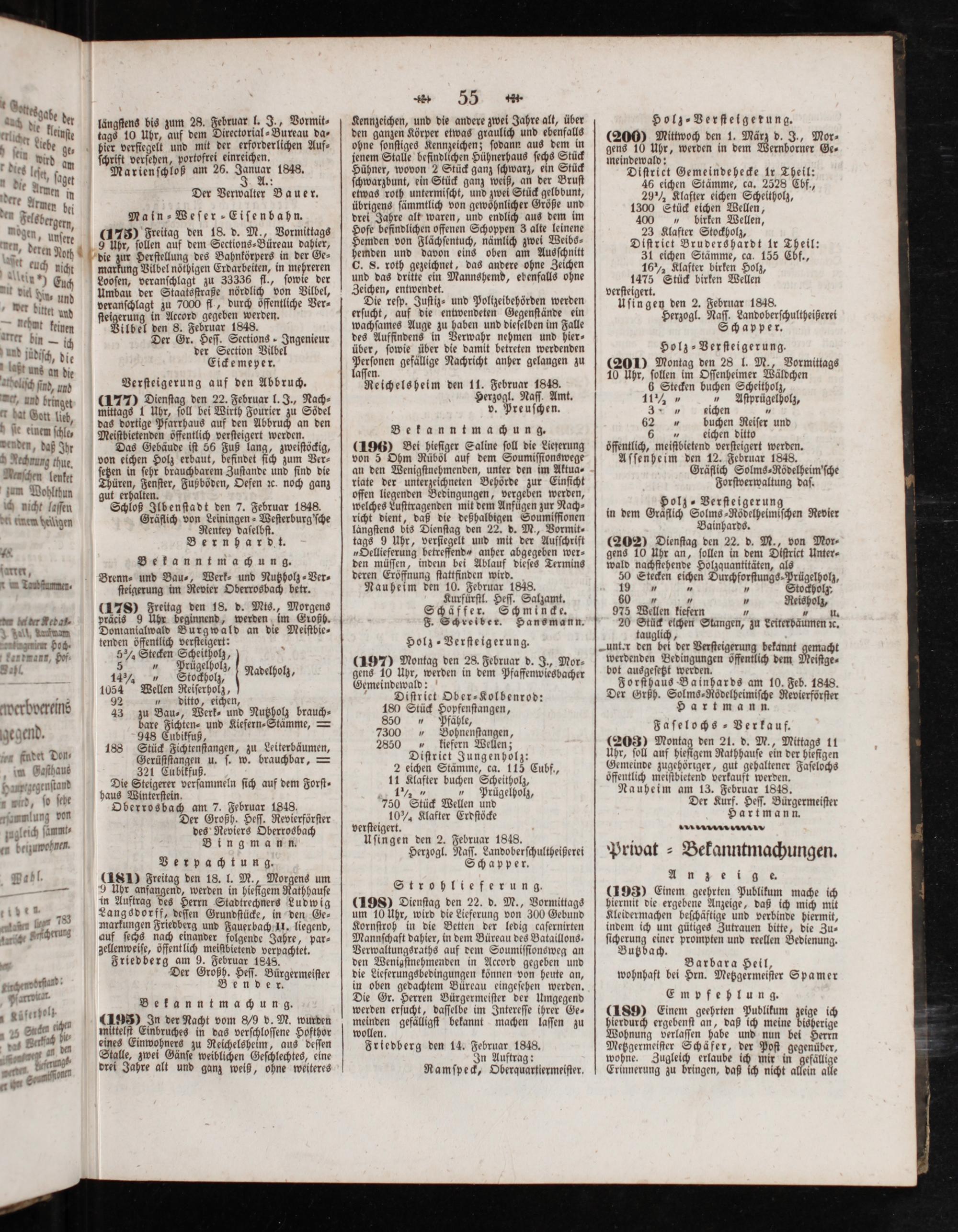 (200) Mittwoch den 1. März d. J., Mor⸗ gens 10 Uhr, werden in dem Wernborner Ge⸗ meindewald: Diſtrict Gemeindehecke ir Theil: 46 eichen Stämme, ca. 2528 Cbf., 29½ Klafter eichen Scheitholz, 1300 Stück eichen Wellen, 400„ birken Wellen, 23 Klafter Stockholz, Diſtriet Brudershardt ir Theil: 31 eichen Stämme, ca. 155 Cbf., 16% Klafter birken Holz, 1475 Stück birken Wellen verſteigert. Uſingen den 2. Februar 1848. Herzogl. Naſſ. Landoberſchultheißerei Schapper. Holz⸗Verſteigerung. (2010 Montag den 28 l. M., Vormittags 10 Uhr, ſollen im Oſſenheimer Wäldchen 6 Stecken buchen Scheitholz, 1172„„ Aſtprügelholz, J„ eichen 1 88 buchen Reiſer und 2 eichen ditto öffentlich, meiſtbietend verſteigert werden. Aſſenheim den 12. Februar 1848. Gräflich Solms⸗Rödelheim'ſche Forſtverwaltung daſ.