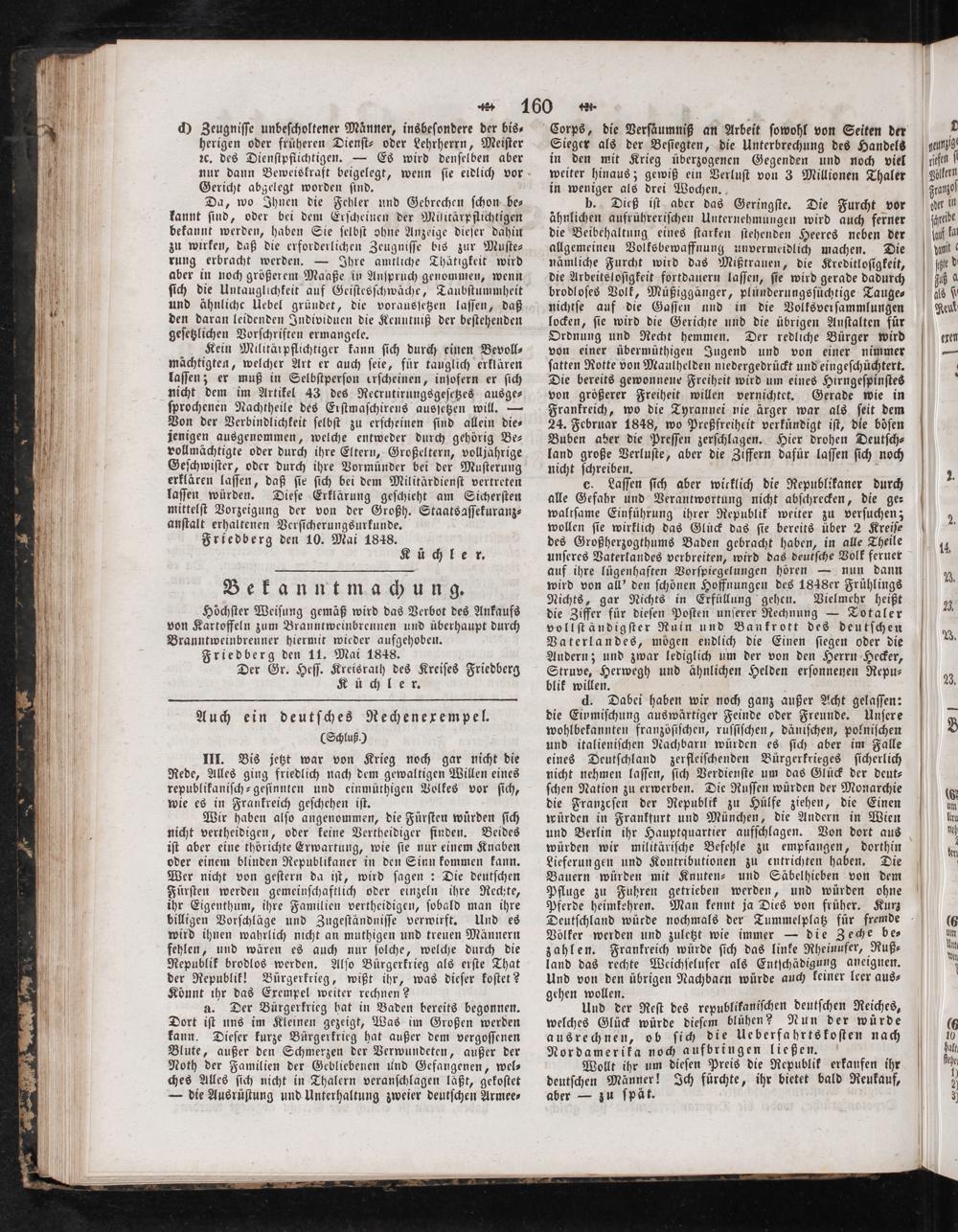 c. Laſſen ſich aber wirklich die Republikaner durch alle Gefahr und Verantwortung nicht abſchrecken, die ge⸗ waltſame Einführung ihrer Republik weiter zu verſuchen; wollen ſie wirklich das Gluck das ſie bereits uber 2 Kreiſe des Großherzogthums Baden gebracht haben, in alle Theile unſeres Vaterlandes verbreiten, wird das deutſche Volk ferner auf ihre luͤgenhaften Vorſpiegelungen hören— nun dann wird von all' den ſchönen Hoffnungen des 1848er Frühlings Nichts, gar Nichts in Erfüllung gehen. Vielmehr heißt die Ziffer für dieſen Poſten unſerer Rechnung— Totaler vollſtändigſter Ruin und Bankrott des deutſchen Vaterlandes, mögen endlich die Einen ſiegen oder die Andern; und zwar lediglich um der von den Herrn Hecker, Struve, Herwegh und ähnlichen Helden erſonnenen Repu— blik willen. 5