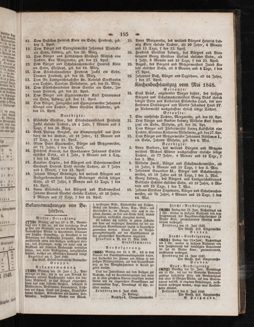 Beerdigte: Eliſabethe Chriſtine, des Eiſenbahnaufſehers Friedrich Jockel eheliche Tochter, alt 1 Jahr, 7 Monate und 2 Tage, 7 den 30. März.. Ernſt Philipp Berghof, ein Klempnergeſell aus Frei— burg an der Unſtrut, alt 18 Jahre, 11 Monate und 27 Tage, 1 den 11. April. i Adam Peter Sparwaſſer, Bürger und Metzgermeiſter, alt 71 Jahre, 7 den 13. April. Friedrich Konrad, des Gensdarmen Johannes Schäfer ehelicher Sohn, alt 1 Jahr, 9 Monate und 1 Tag, 1 den 14. April. Karoline Sophie, des Burgers und Schreinermeiſters Chriſtoph Dietrich Diehl eheliche Tochter, alt 7 Jahre und 1 Monat, 1 den 13. April. Johann Wenzel Grüninger, des weiland Burgers und Rothgerbermeiſters Ludwig Grüninger ehelich lediger Sohn, alt 67 Jahre, 8 Monate und 15 Tage, 5 den 16. April. Anna Eliſabetha, des Bürgers und Bäckermeiſters Johann Konrad Wendel eheliche Tochter, alt 16 Jahre, 2 Monate und 27 Tage, r den 19. April.