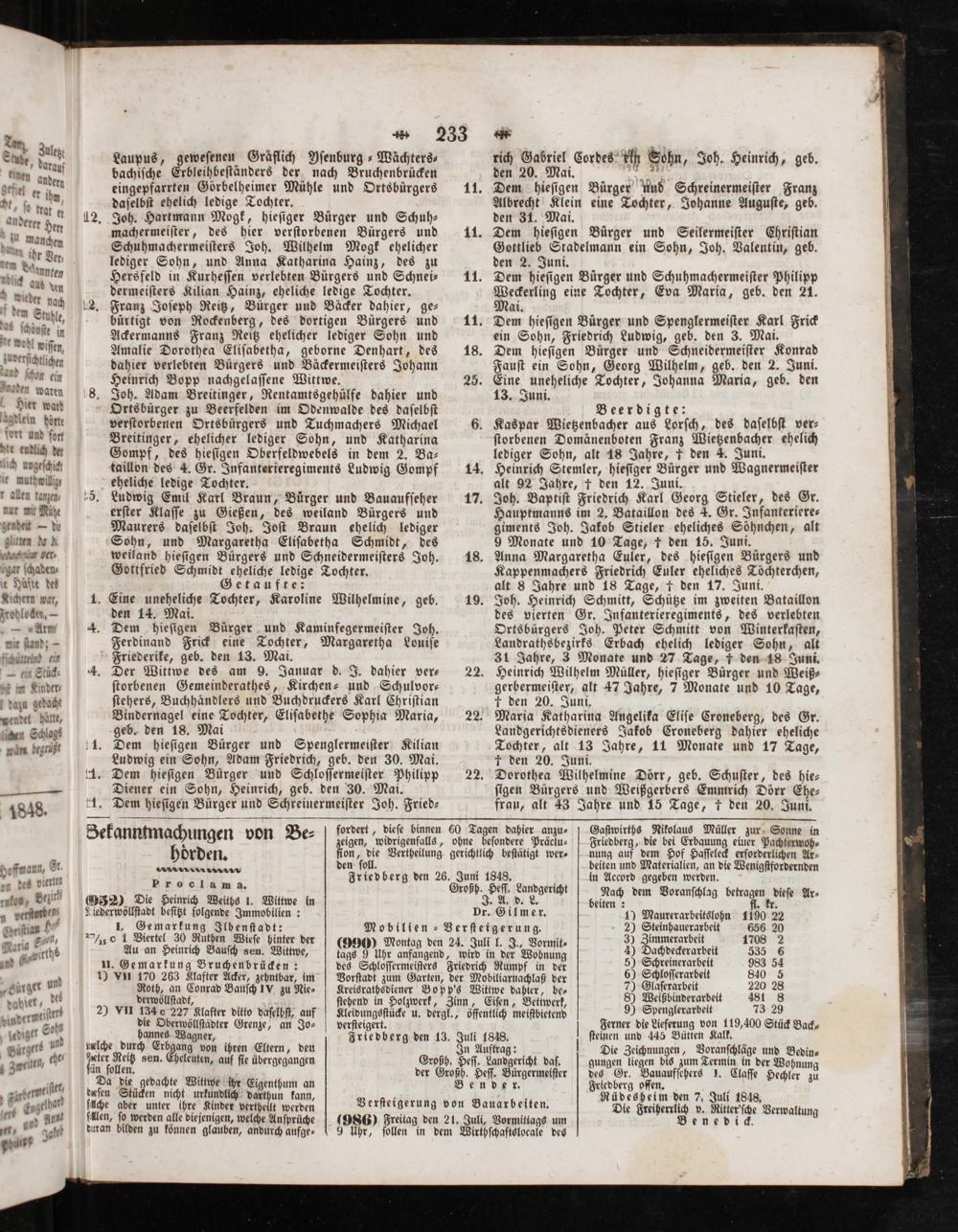 fordert, dieſe binnen 60 Tagen dahier anzu⸗ zeigen, widrigenfalls, ohne beſondere Präclu⸗ ſion, die Vertheilung gerichtlich beſtätigt wer⸗ den ſoll. Friedberg den 26. Juni 1848. Großh. Heſſ. Landgericht Aa. L. Dr. Gilmer. Mobilien-Verſteigerung. (990) Montag den 24. Juli l. J., Vormit⸗ tags 9 Uhr anfangend, wird in der Wohnung des Schloſſermeiſters Friedrich Rumpf in der Vorſtadt zum Garten, der Mobiliarnachlaß der Kreisrathsdiener Bopp's Wittwe dahier, be⸗ ſtehend in Holzwerk, Zinn, Eiſen, Bettwerk, Kleidungsſtücke u. dergl., öffentlich meiſtbietend verſteigert. Friedberg den 13. Juli 1848. In Auftrag: Großh. Heſſ. Landgericht daf. der Großh. Heſſ. Bürgermeiſter Bender.