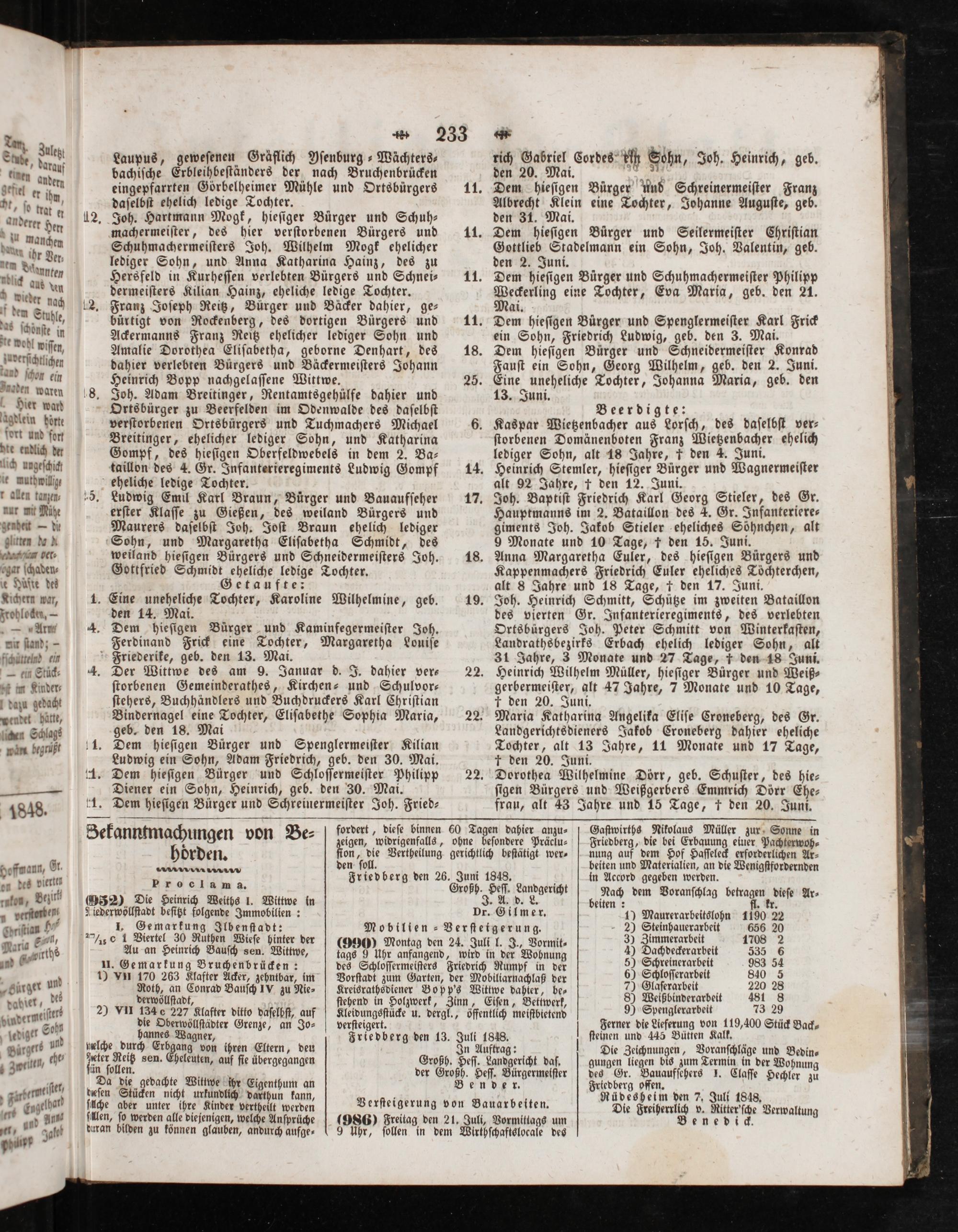 Laupus, geweſenen Gräflich Yſenburg-Wächters⸗ bachiſche Erbleihbeſtänders der nach Bruchenbrücken eingepfarrten Görbelheimer Mühle und Ortsbürgers daſelbſt ehelich ledige Tochter. Joh. Hartmann Mogk, hieſiger Buͤrger und Schuh— machermeiſter, des hier verſtorbenen Bürgers und Schuhmachermeiſters Joh. Wilhelm Mogk ehelicher lediger Sohn, und Anna Katharina Hainz, des zu Hersfeld in Kurheſſen verlebten Bürgers und Schnei⸗ dermeiſters Kilian Hainz, eheliche ledige Tochter. Franz Joſeph Reitz, Bürger und Bäcker dahier, ge— bürtigt von Rockenberg, des dortigen Bürgers und Ackermanns Franz Reitz ehelicher lediger Sohn und Amalie Dorothea Eliſabetha, geborne Denhart, des dahier verlebten Bürgers und Bäckermeiſters Johann Heinrich Bopp nachgelaſſene Wittwe. Joh. Adam Breitinger, Rentamtsgehülfe dahier und Ortsbürger zu Beerfelden im Odenwalde des daſelbſt verſtorbenen Ortsbürgers und Tuchmachers Michael Breitinger, ehelicher lediger Sohn, und Katharina Gompf, des hieſigen Oberfeldwebels in dem 2. Ba- taillon des 4. Gr. Infanterieregiments Ludwig Gompf eheliche ledige Tochter. Ludwig Emil Karl Braun, Buͤrger und Bauaufſeher erſter Klaſſe zu Gießen, des weiland Bürgers und Maurers daſelbſt Joh. Joſt Braun ehelich lediger Sohn, und Margaretha Eliſabetha Schmidt, des weiland hieſigen Bürgers und Schneidermeiſters Joh. Gottfried Schmidt eheliche ledige Tochter. Getaufte: