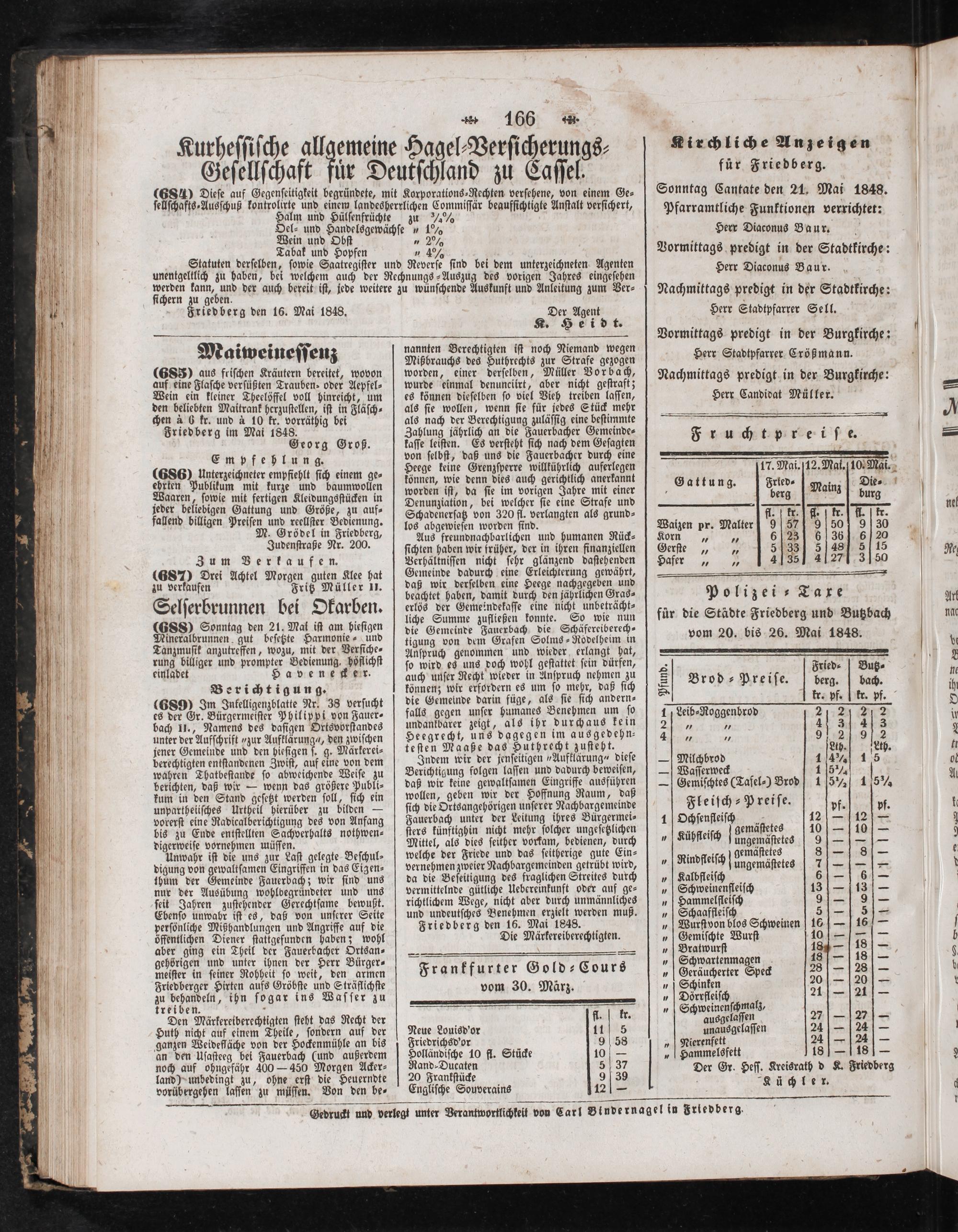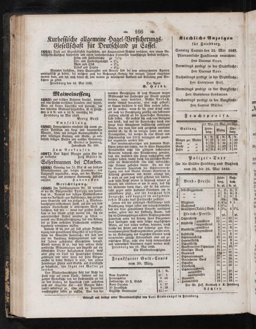 Kirchliche Anzeigen für Friedberg. Sonntag Cantate den 21. Mai 1848. Pfarramtliche Funktionen verrichtet: Herr Diaconus Baur. a Vormittags predigt in der Stadtkirche: Herr Diaconus Baur. Nachmittags predigt in der Stadtkirche: Herr Stadtpfarrer Sell. Vormittags predigt in der Burgkirche: Herr Stadtpfarrer Crößmann. Nachmittags predigt in der Burgkirche: Herr Candidat Müller.