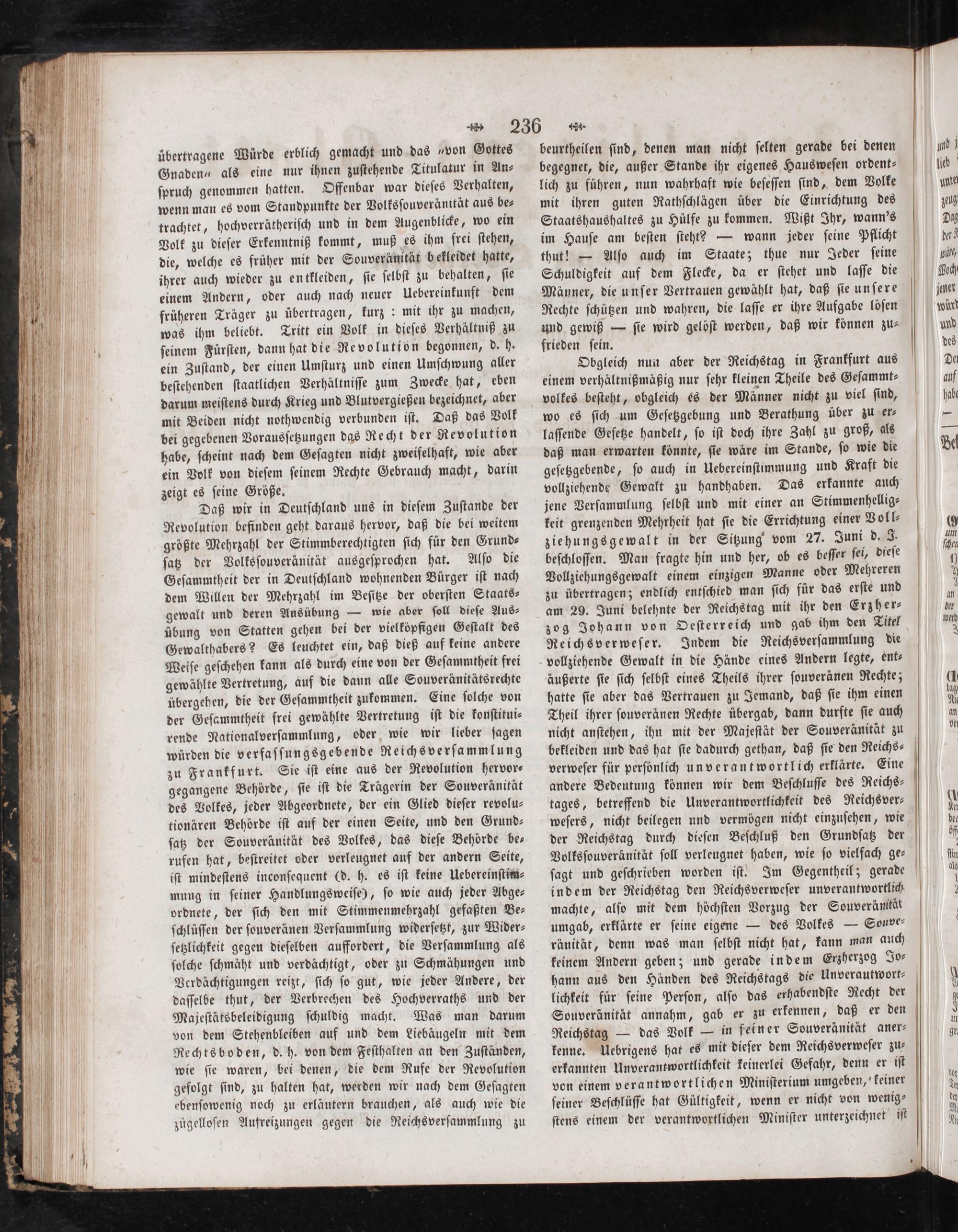 wo es ſich um Geſetzgebung und Berathung über zu er— laſſende Geſetze handelt, ſo iſt doch ihre Zahl zu groß, als daß man erwarten könnte, ſie wäre im Stande, ſo wie die geſetzgebende, ſo auch in Uebereinſtimmung und Kraft die vollziehende Gewalt zu handhaben. Das erkannte auch jene Verſammlung ſelbſt und mit einer an Stimmenhellig⸗ keit grenzenden Mehrheit hat ſie die Errichtung einer Voll⸗ ziehungsgewalt in der Sitzung vom 27. Juni d. J. beſchloſſen. Man fragte hin und her, ob es beſſer ſei, dieſe Vollziehungsgewalt einem einzigen Manne oder Mehreren zu übertragen; endlich entſchied man ſich für das erſte und am 29. Juni belehnte der Reichstag mit ihr den Erzher⸗ zog Johann von Oeſterreich und gab ihm den Titel Reichsverweſer. Indem die Reichs verſammlung die vollziehende Gewalt in die Hände eines Andern legte, ent⸗ äußerte ſie ſich ſelbſt eines Theils ihrer ſouveränen Rechte; hatte ſie aber das Vertrauen zu Jemand, daß ſie ihm einen Theil ihrer ſouveränen Rechte übergab, dann durfte ſie auch nicht anſtehen, ihn mit der Majeſtät der Souveränität zu
