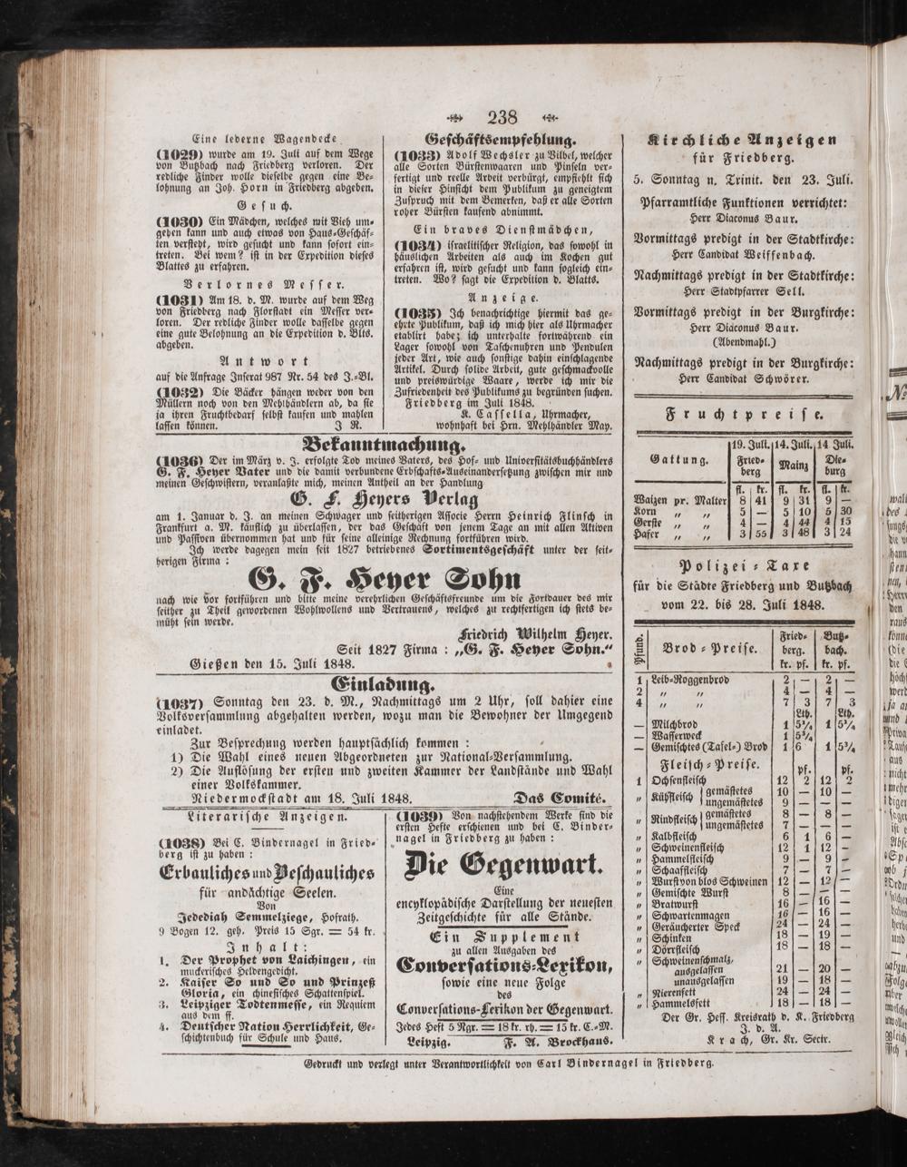 Gedruckt und verlegt unter Verantwortlichkeit von Carl Bindernagel in Friedberg.