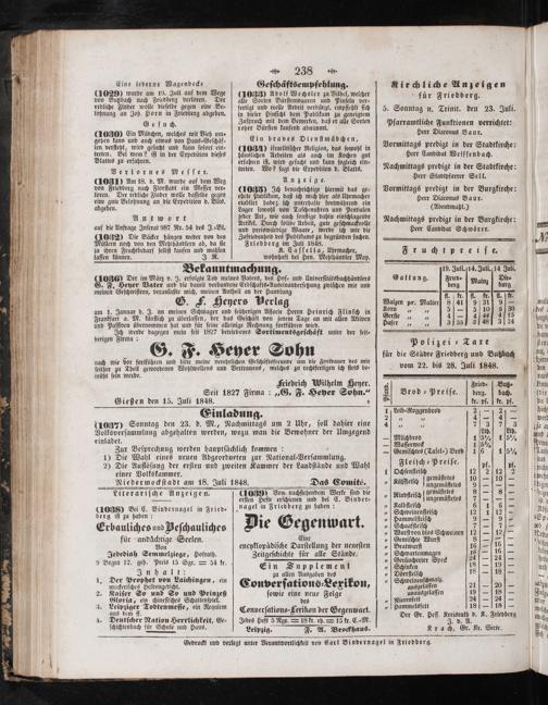 müht ſein werde. 1470 f 1— Hriedrich Wilhelm Heyer. i Fried⸗ But⸗ Seit 1827 Firma:„G. F. Heyer Sohn.“ 3 Brod⸗Preiſe. berg. bach. Gießen den 15. Juli 1848. 8 kr. pf.] kr. pf. Einladung 1 Leib⸗Roggenbrod 2— 4— N. 8 7 2 2, 7 8 9 (1037) Sonntag den 23. d. M., Nachmittags um 2 Uhr, ſoll dahier eine 4% 5. Volksverſammlung abgehalten werden, wozu man die Bewohner der Umgegend Stb.„tb, einladet. 705 aide 4 80% 165% Zur Beſprechung werden hauptſächlich kommen!:. 2 Gemiſchtes(Tafel-) Brod 1161 5% 1) Die Wahl eines neuen Abgeordneten zur National-Verſammlung. leiſch⸗Preiſe