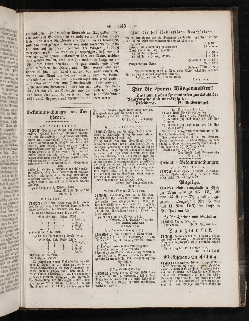 Zuſammen 87„ 59. Die Sammlung wird zu Ende dieſer Woche geſchloſſen und der Ertrag nach Frankfurt abgeſchickt werden. Friedberg den 22. Oktober 1848. Der d x.