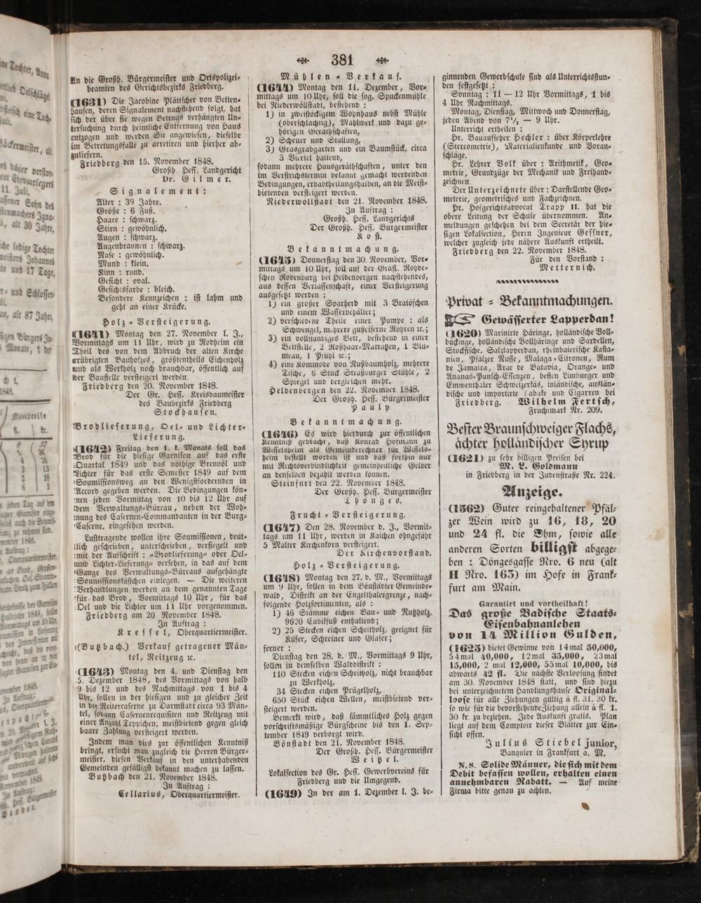 (1647) Den 28. November d. J., Vormit⸗ tags um 11 Uhr, werden in Kaichen ohngefähr 5 Malter Kirchenkorn verſteigert. Der Kirchenvorſtand. Holz ⸗-Verſteigerung. (1618) Montag den 27. d. M., Vormittags um 9 Uhr, ſollen in dem Vönſtädter Gemeinde- wald, Diſtrikt an der Engelthalergrenze, nach— folgende Holzſortimenten, als: 1) 46 Stämme eichen Bau- und Nutzholz, 9620 Cubikfuß enthaltend; 2) 25 Stecken eichen Scheitholz, geeignet für Küfer, Schreiner und Glaſer; ferner: Dienſtag den 28. d. M., Vormittags 9 Uhr, ſollen in demſelben Walddiſtrikt: 110 Stecken eichen Scheitholz, nicht brauchbar zu Werkholz, 34 Stecken eichen Prügelholz, 650 Stück eichen Wellen, meiſtbietend ver— ſteigert werden. 5 Bemerkt wird, daß ſämmtliches Holz gegen vorſchriftsmäßige Bürgſcheine bis den 1. Sep- tember 1849 verborgt wird. Bönſtadt den 21. November 1848. Der Großh. Heſf. Bürgermeiſter Weitzel. Lokalſection des Gr. Heſſ. Gewerbvereins für Friedberg und die Umgegend.
