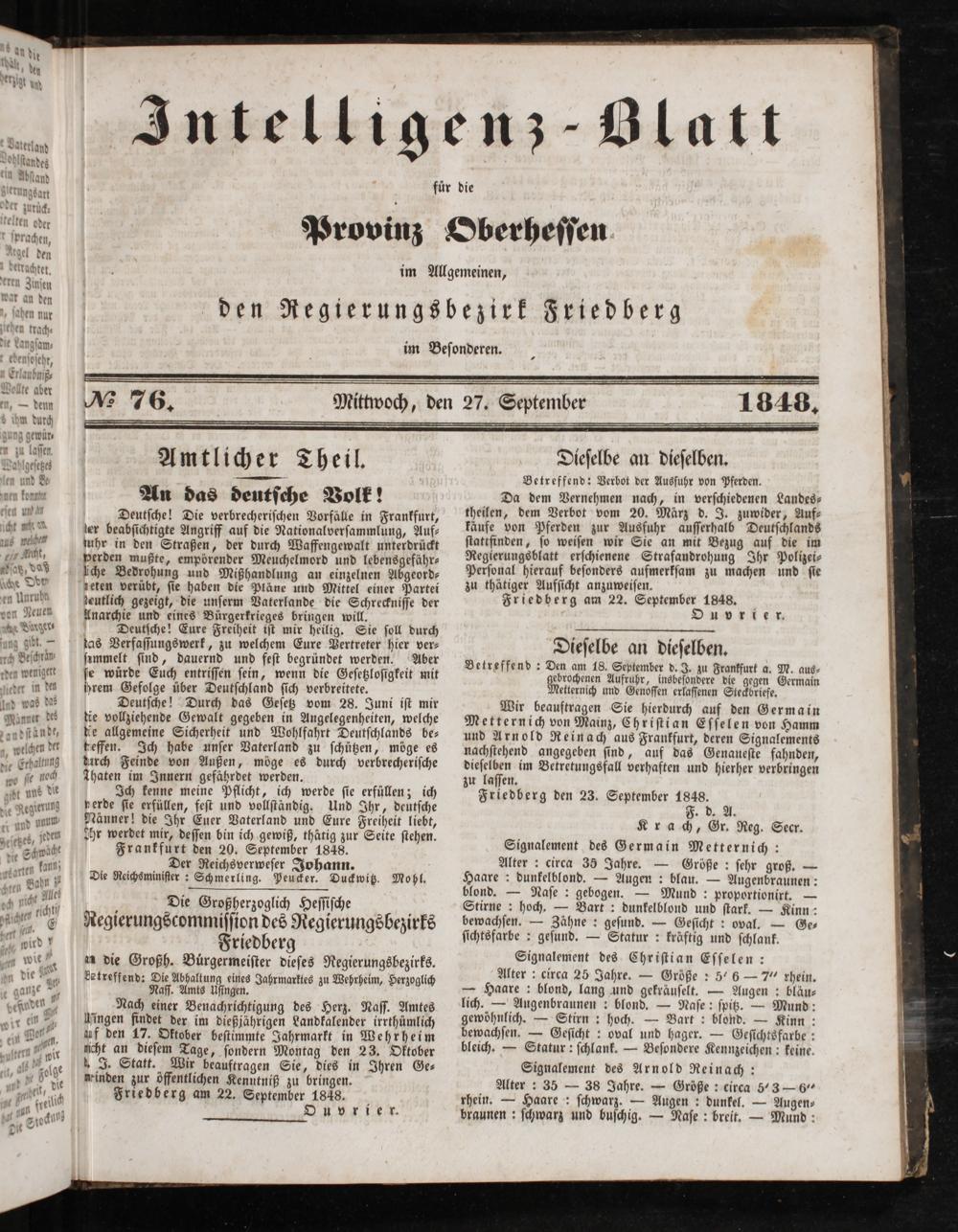 Betreffend: Den am 18. September d. J. zu Frankfurt a. M. aus⸗ gebrochenen Aufruhr, insbeſondere die gegen Germain Metternich und Genoſſen erlaſſenen Steckbriefe.