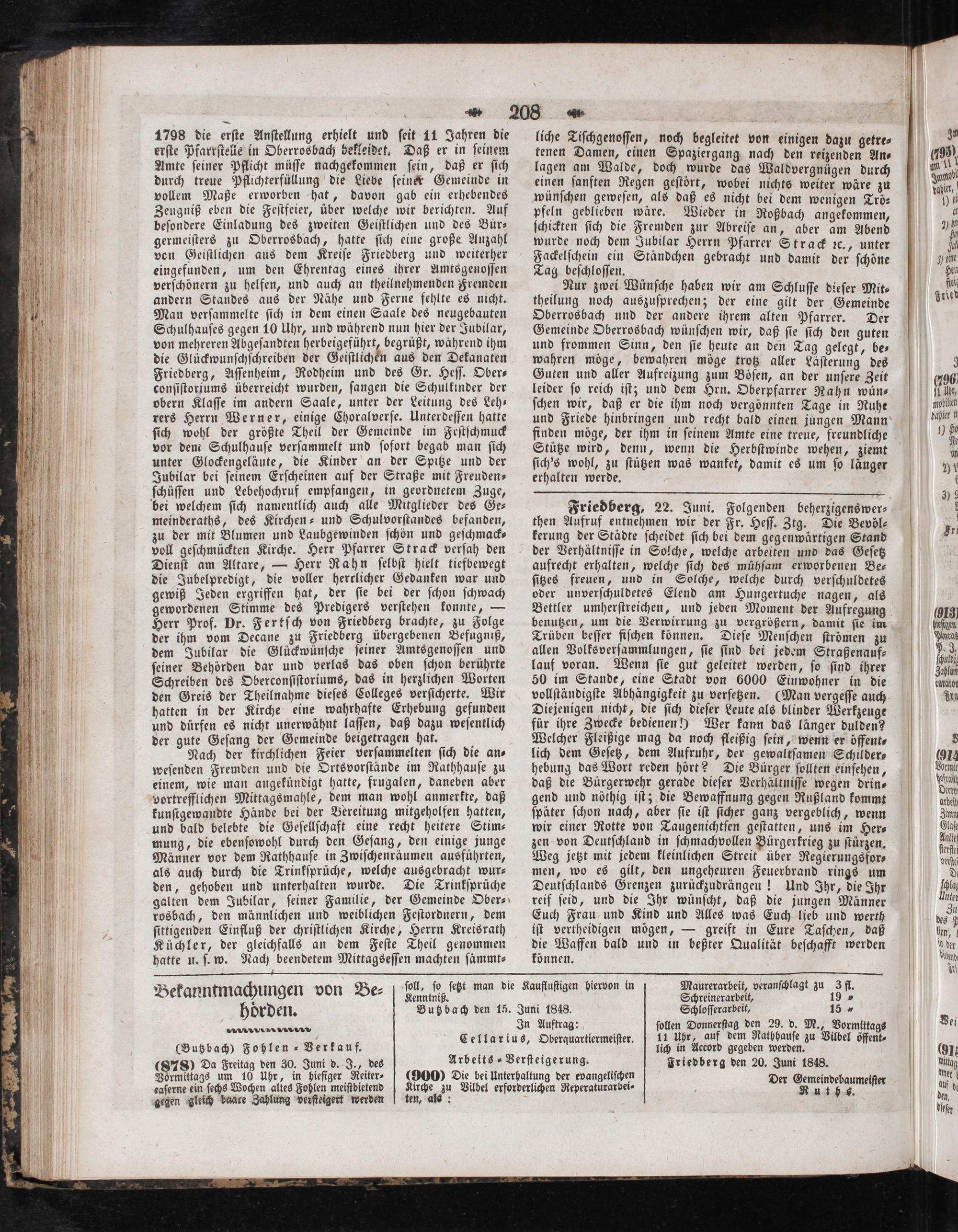 Friedberg, 22. Juni. Folgenden beherzigenswer⸗ then Aufruf entnehmen wir der Fr. Heſſ. Ztg. Die Bevöl⸗ kerung der Städte ſcheidet ſich bei dem gegenwartigen Stand der Verhältniſſe in Solche, welche arbeiten und das Geſetz aufrecht erhalten, welche ſich des mühſam erworbenen Be— ſitzes freuen, und in Solche, welche durch verſchuldetes oder unverſchuldetes Elend am Hungertuche nagen, als Bettler umherſtreichen, und jeden Moment der Aufregung benutzen, um die Verwirrung zu vergrößern, damit ſie im Trüben beſſer fiſchen können. Dieſe Menſchen ſtrömen zu allen Volksverſammlungen, ſie ſind bei jedem Straßenauf⸗ lauf voran. Wenn ſie gut geleitet werden, ſo ſind ihrer 50 im Stande, eine Stadt von 6000 Einwohner in die vollſtändigſte Abhängigkeit zu verſetzen.(Man vergeſſe auch Diejenigen nicht, die ſich dieſer Leute als blinder Werkzeuge für ihre Zwecke bedienen!) Wer kann das länger dulden? Welcher Fleißige mag da noch fleißig ſein, wenn er öffent⸗ lich dem Geſetz, dem Aufruhr, der gewaltſamen Schilder— hebung das Wort reden hört? Die Bürger ſollten einſehen, daß die Bürgerwehr gerade dieſer Verhältniſſe wegen drin⸗ gend und nöthig iſt; die Bewaffnung gegen Rußland kommt ſpäter ſchon nach, aber ſie iſt ſicher ganz vergeblich, wenn wir einer Rotte von Taugenichtſen geſtatten, uns im Her⸗ zen von Deutſchland in ſchmachvollen Bürgerkrieg zu ſtürzen. Weg jetzt mit jedem kleinlichen Streit über Regierungsfor⸗ men, wo es gilt, den ungeheuren Feuerbrand rings um Deutſchlands Grenzen zurückzudrängeu! Und Ihr, die Ihr reif ſeid, und die Ihr wünſcht, daß die jungen Männer Euch Frau und Kind und Alles was Euch lieb und werth iſt vertheidigen mögen,— greift in Eure Taſchen, daß die Waffen bald und in beßter Qualität beſchafft werden können.