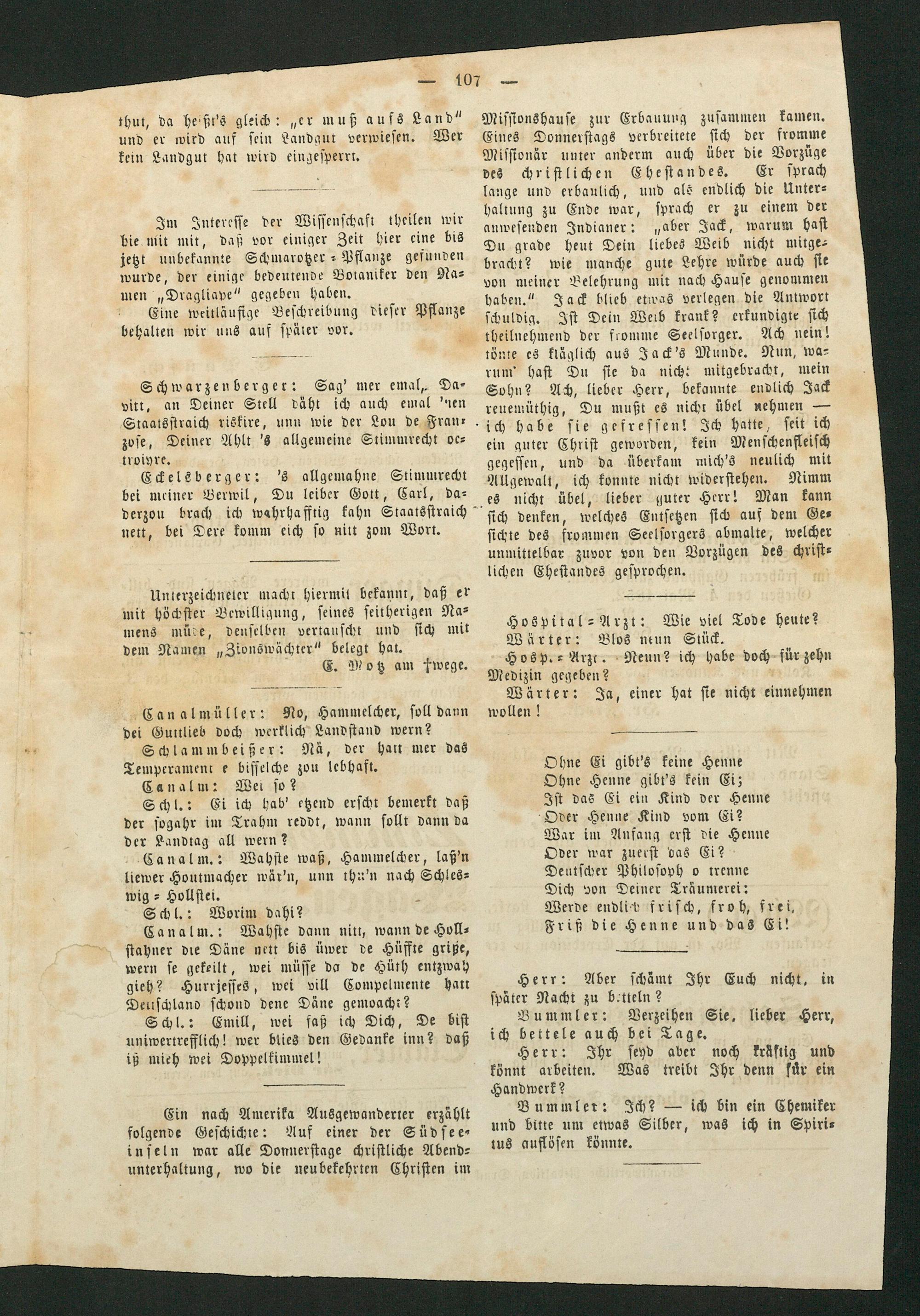 Im Interesse der Wissenschaft theilen wir bie mit mit, daß vor einiger Zeit hier eine bis jetzt unbekannte Schmarotzer Pflanze gefunden wurde, der einige bedeutende Botaniker den Na⸗ men„Dragliape“ gegeben haben.