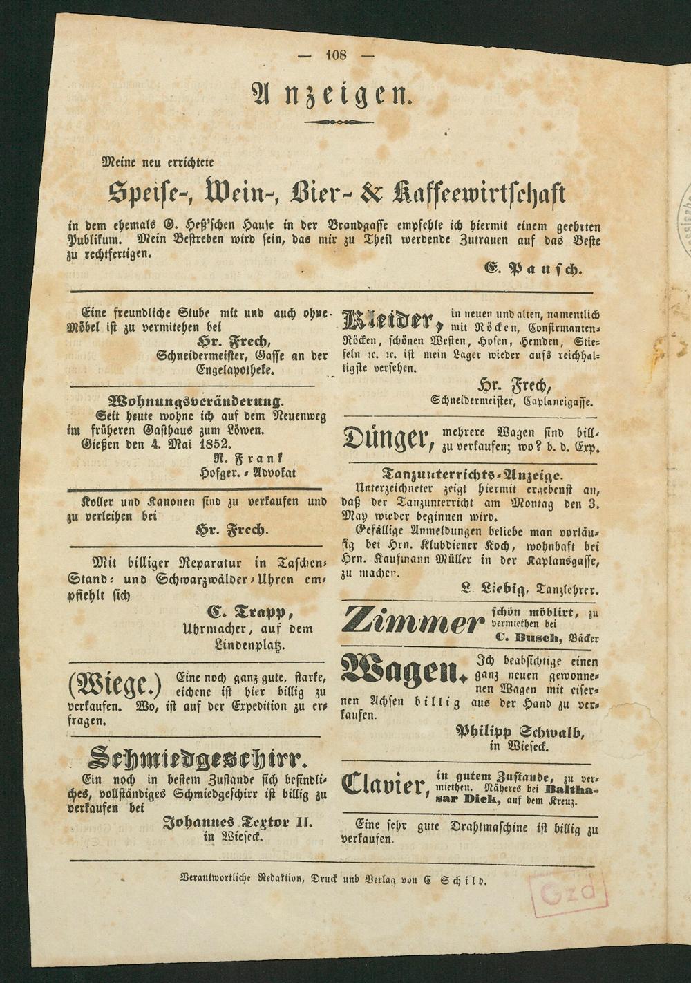 Wohnungsveränderung. Seit heute wohne ich auf dem Neuenweg im früheren Gasthaus zum Löwen. Gießen den 4. Mai 1852. R. Frank Hofger.⸗ Advokat