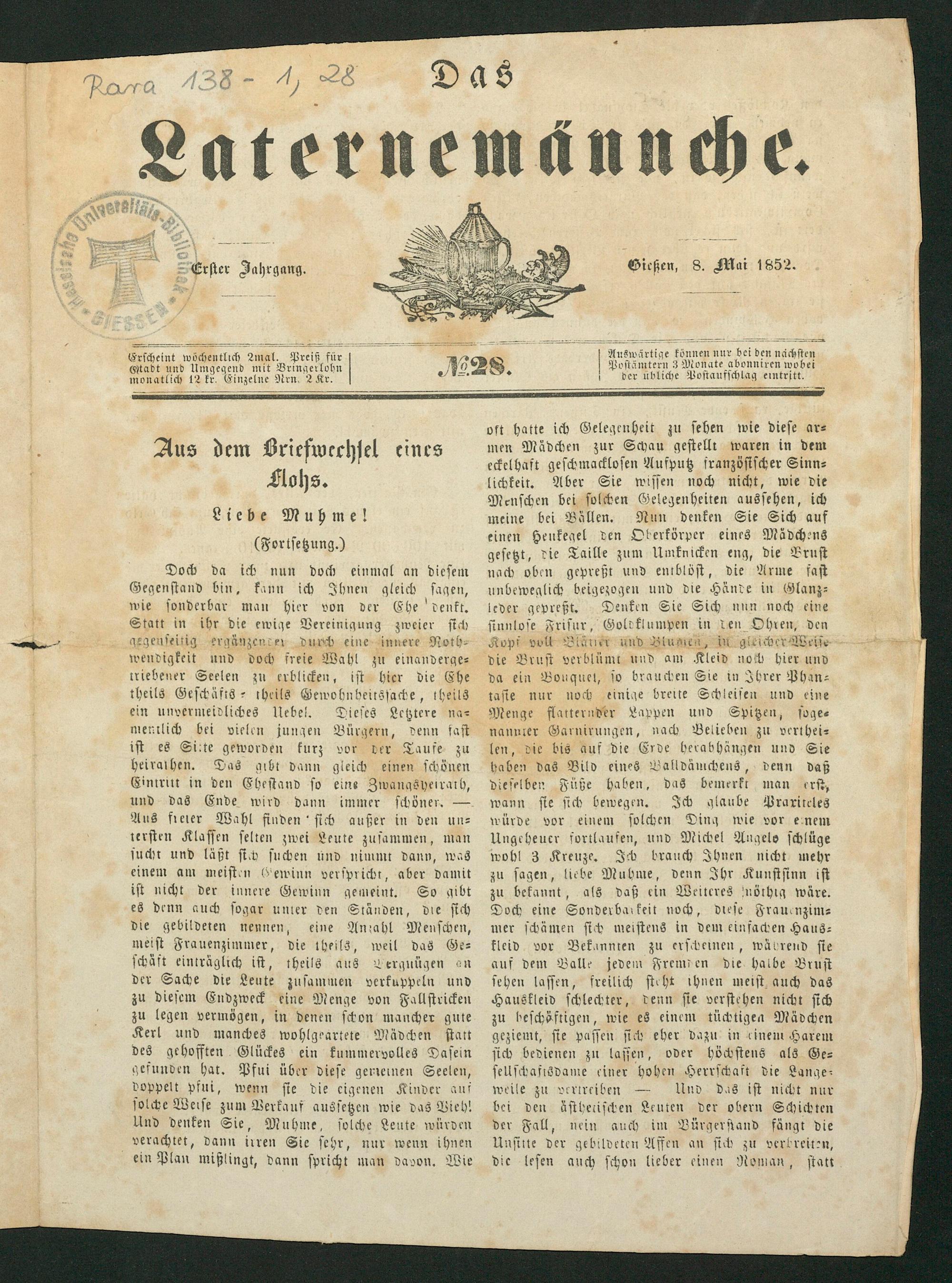 oft hatte ich Gelegenheit zu sehen wie diese ar— men Madchen zur Schau gestellt waren in dem eckelhaft geschmacklosen Aufputz französtscher Sinn⸗ lichkeit. Aber Sie wissen noch nicht, wie die Menschen bei solchen Gelegenheiten aussehen, ich meine bei Bällen. Nun denken Sie Sich auf einen Heukegel den Oberkörper eines Mädchens gesetzt, die Taille zum Umknicken eng, die Brust nach oben gepreßt und entblöst, die Arme fast unbeweglich beigezogen und die Hände in Glanz⸗ leder gepreßt. Denken Sie Sich nun noch eine sinnlose Frisur, Goldklumpen in den Ohren, den Kopf voll Blätier und Blumen, iu ugleicher Weise⸗ die Brust verblümt und am Kleid noch hier und da ein Bouquet, so brauchen Sie in Ihrer Phan⸗ tasie nur noch einige breite Schleisen und eine Menge flatternder Lappen und Spitzen, soge⸗ nannter Garnirungen, nach Belieben zu verthei— len, die bis auf die Erde herabhängen und Sie haben das Bild eines Balldämchens, denn daß dieselben Füße haben, das bemerkt man erst, wann sie sich bewegen. Ich glaube Praxiteles würde vor einem solchen Ding wie vor einem Ungeheuer fortlaufen, und Michel Angels schlüge wohl 3 Kreuze. Ich brauch Ihnen nicht mehr zu sagen, liebe Muhme, denn Ihr Kunstsinn ist zu bekannt, als daß ein Weiteres möthig wäre. Doch eine Sonderbarkeit noch, diese Frauenzim- mer schämen sich meistens in dem einfachen Haus— kleid vor Bekannten zu erscheinen, wäbrend sie auf dem Balle jedem Fremen die halbe Brust sehen lassen, freilich steht ihnen meist auch das Hauskleid schlechter, denn sie verstehen nicht sich zu beschöftigen, wie es einem tüchtigen Mädchen geziemt, sie passen sich eher dazu in einem Harem sich bedienen zu lassen, oder höchstens als Ge— sellschaftsdame einer hohen Herrschaft die Lange⸗ weile zu vertreiben— Und das ist nicht nur bei den ästhetischen Leuten der obern Schichten der Fall, nein auch im Bürgerstand fängt die Unsitte der gebildeten Affen an sich zu verbreiten, die lesen auch schon lieber einen Roman, statt