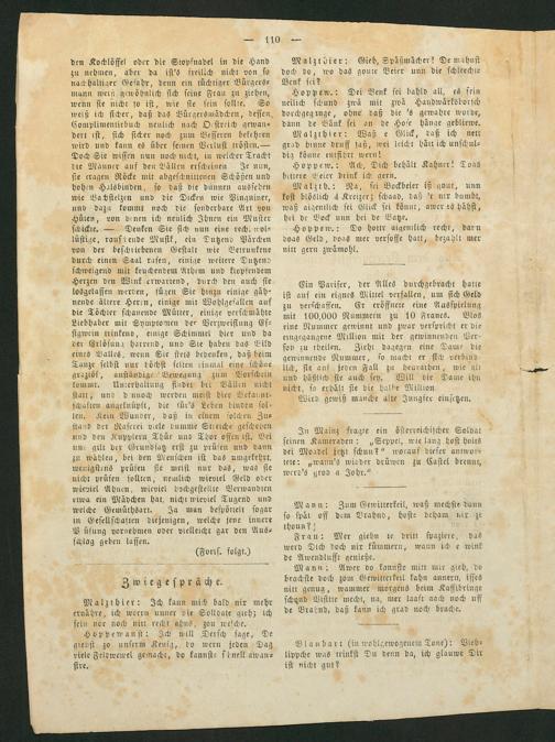 Malzth.: Na, sei Bockbeier iß gout, unn kost blöslich 4 Kreizer; schaad, daß'r nix bumbt, waß aigentlich sei Glick sei könnt, awer es hähst, hei de Bock unn hei de Batze.