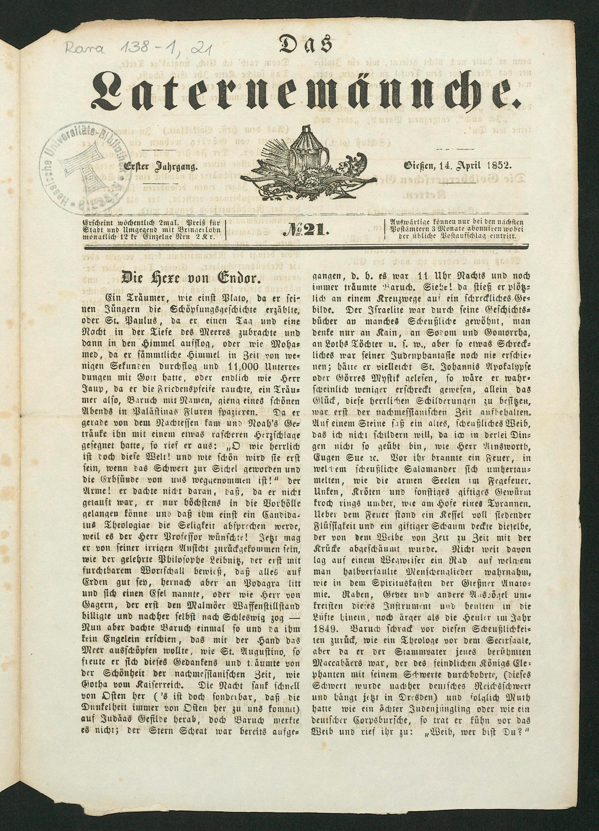 Erscheint wöchentlich mal. Preiß für Stadt und Umgegend mit Bringerlohn monatlich 12 kr Einzelne Nrn 2 Kr.