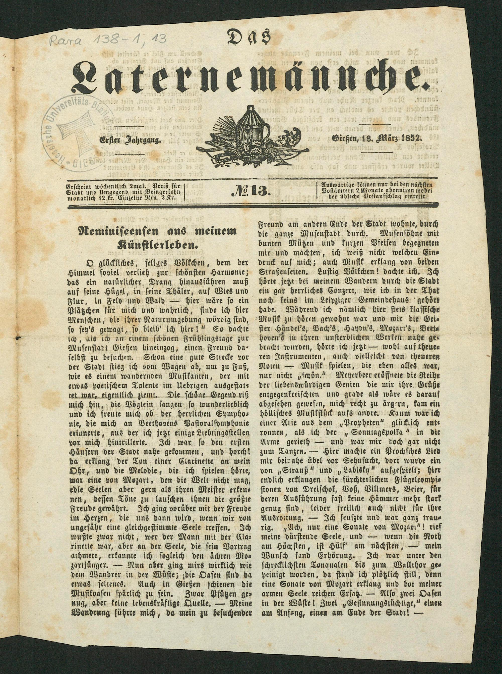 O glückliches, seliges Voͤlkchen, dem der Himmel soviel verlieh zur schönsten Harmonie; das ein natürlicher Drang hinausführen muß auf seine Hügel, in seine Thäler, auf Wies und Flur, in Feld und Wald— hier wäre so ein Plätzchen für mich und wahrlich, finde ich hier Menschen, die ihrer Naturumgebung wördig sind, so sey's gewagt, so bleib' ich hier!“ So dachte ich, als ich an einem schönen Frühlingstage zur Musenstadt Gießen hineinzog, einen Freund da⸗ selbst zu besuchen. Schon eine gute Strecke vor der Stadt stieg ich vom Wagen ab, um zu Fuß, wie es einem wandernden Musikanten, der mit etwas poetischem Talente im Uebrigen ausgestat⸗ tet war, eigentlich ziemt. Die schöne Gegend riß mich hin, die Vöglein sangen so wunderlieblich und ich freute mich ob der herrlichen Sympho⸗ nie, die mich an Beethovens Pastoralsymphonie erianerte, aus der ich jetzt einige Lieblingsstellen vor mich hintrillerte. Ich war so den ersten Häusern der Stadt nahe gekommen, und horch! da erklang der Ton einer Clarinette an mein Ohr, und die Melodie, die ich spielen hörie, war eine von Mozart, den die Welt nicht mag, edle Seelen aber gern als ihren Meister erken⸗ nen, dessen Töne zu lauschen ihnen die größte Freude gewährt. Ich ging vorüber mit der Freude im Herzen, die uns dann wird, wenn wir von ungefähr eine gleichgestimmte Seele treffen. Ich wußte zwar nicht, wer der Mann mit der Cla⸗ rinette war, aber an der Seele, die sein Vortrag athmete, erkannte ich sogleich den ächten Mo⸗ zartjünger.— Nun aber ging mirs wirklich wie dem Wandrer in der Wuͤste; die Oasen sind da etwas seltenes. Auch in Gießen schienen die Musikoasen spärlich zu sein. Zwar Pfützen ge⸗ nug, aber keine lebenskräftige Quelle.— Meine Wandrung führte mich, da mein zu besuchender