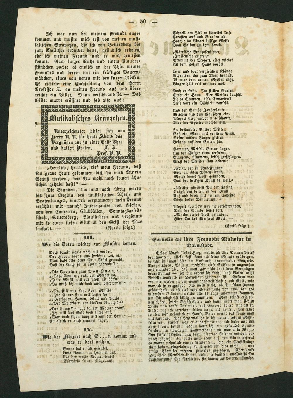 ildetsten Ständen, welche alle 14 Tage zusammen kommen, um sich möglichst billig zu amüsiren. Man trinkt erst ei⸗ nen Thee, spielt Schaͤferspiele und dann führt man sich zu Tische und denke Dir nur, das Couvert kostet nur 18 kr. Vater und ich verzehren selten mehr, als 48 kr., den Thee trinken wir nehmlich zu Hause, Vater meint vas könne man mit Anstand. Dak Letzremal hatte ich meinen rothen Mous⸗ selin an, früher war er ausgeschnitten, ich habe mir ihn aber ändern lassen, sodann hatte ich ein gestelltes Chemi⸗ settchen mit schwarzem Sammetband und war a la Wahn⸗ sinn frisirt(Oppermann sagte niedrige Stirnen würden da⸗ durch höher). Ich hatte mich recht auf den Abend gefreut es waren nehmlich einige Studenten, die ein Musikfränz⸗ chen haben, eingeladen; sonst geschieht dies nicht— nur einige Chemiker werden zuweilen zugezogen, Aber denke Dir, diese Menschen kamen nicht, sie dankten undꝛweißt Du auch warum Sie fürchteten, sie kämen ins Latern mäunche.