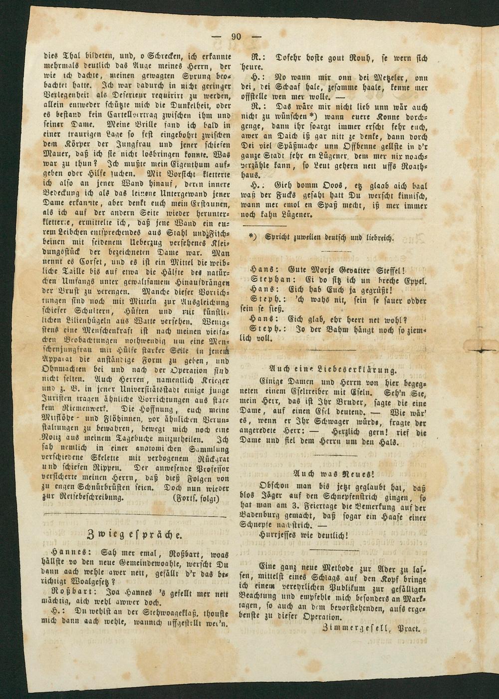 R.: Das wäre mir nicht lieb unn wär auch nicht zu wünschen) wann euere Konne dorch—⸗ genge, dann ihr soargt immer erscht fehr euch, awer an Daich iß gar nitt ze denke, dann dorch Dei viel Späßmache unn Offbenne gellste in d'r ganze Stadt fehr en Lügener, dem mer nix noach⸗ verzähle kann, so Leut gehern nett uffs Roath⸗ haus.
