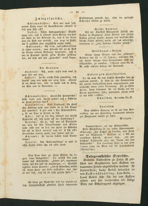Sicheren Nachrichten zu Folge ist zwi⸗ schen den Engländern und Kaffern ein dauernder Friede abgeschlossen worden sie fraternisiren; Lady Reböl heirathet ei⸗ nen Kaffernhäuptling, Lon-Refu.— Lord Reböl läßt sich bei den Kaffern nieder und hat versprochen die lästige Sitte des Schaltragens abzulegen.