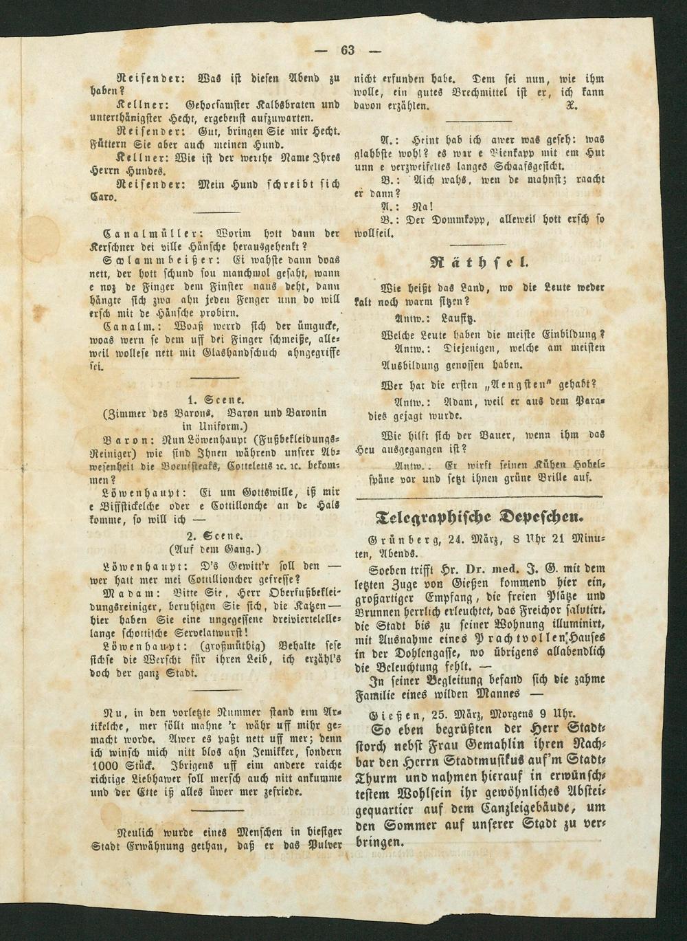 Soeben trifft Hr. Dr. med. J. G. mit dem letzten Zuge von Gießen kommend hier ein, großartiger Empfang, die freien Plätze und Brunnen herrlich erleuchtet, das Freichor salvtirt, die Stadt bis zu seiner Wohnung illuminirt, mit Ausnahme eines Prachtvol len, Hauses in der Dohlengasse, wo übrigens allabendlich die Beleuchtung fehlt.—