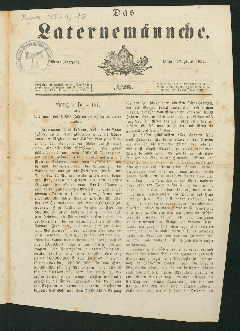 Jedermann ist es bekannt, daß nie ein Stgat größer, nie ein Volk glückticher war, als China unter der Regierung des Kaisers Pan- pan⸗tsi⸗to⸗ pa hu, der ebensogut ein Sohn des Himmels war, als alle seine Vorgänger. Der Staat zählte damals nur etwa 500,000 Mandarinen, mit rothen, grünen, gelben, blauen, goldnen und silbernen Knöpfen, was eiwa dasselbe ist, wie bei uns, die Herren von, die Barone zu, die Barone von und zu, die Freiherrn, Grafen, mit 7, 9, 12, 14 Ahnen, welche in Oestreich hoffä⸗ hig sind, dann die Herren mit dem goldenen Schlüffel, die Ritter vom Sperlingsklauen, vom rothen und schwarzen Eidechsen-, vom Fuchs⸗ schwanz⸗ Orden u. s. w. u. s.. ferner nur etwa 800,000 Welt Bonzen und 90,000 Kiö— ster der Orbensbonzen, mit circa 1 eh eg In: wohner. wei Millionen Krieger zu Fuß und 500,000 zu Pferd schützten den Steat vor äus⸗ sern Feinden, die sich niemals blicken ließen und vor den in nern, die außerdem noch durch 200,000 Schnau-Zerr oder, wie man hier zu Lans: sagt, Polizeidiener in der sckönsten Ordnung ge⸗ halten wurden. Des Sohnes des Himmels An sehen im Lande war außerdem so groß, daß es nur 5,000,000 Räuber auf festen Burgen wagten, die Unterthanen guszuplündern, welche jährlich W eima 60,000 Lo⸗ sang (etwa 1 000,000 fl. 09 900 an Pan pan⸗ tsi ⸗ to⸗ p hu, 200,009,000 das Heer, 89909 000 für die Wunden 100 50,000 für die So⸗lam psi, oder Schulmeister zu be⸗ zahlen hatten, einige geringen Posten nicht mit⸗ gerechnet, die für den Marstall, die Erbauung von Casernen ꝛc. verwendet wurden. Außerdem bezahlte das Volk nur etwa 70,000,000 Lo sang