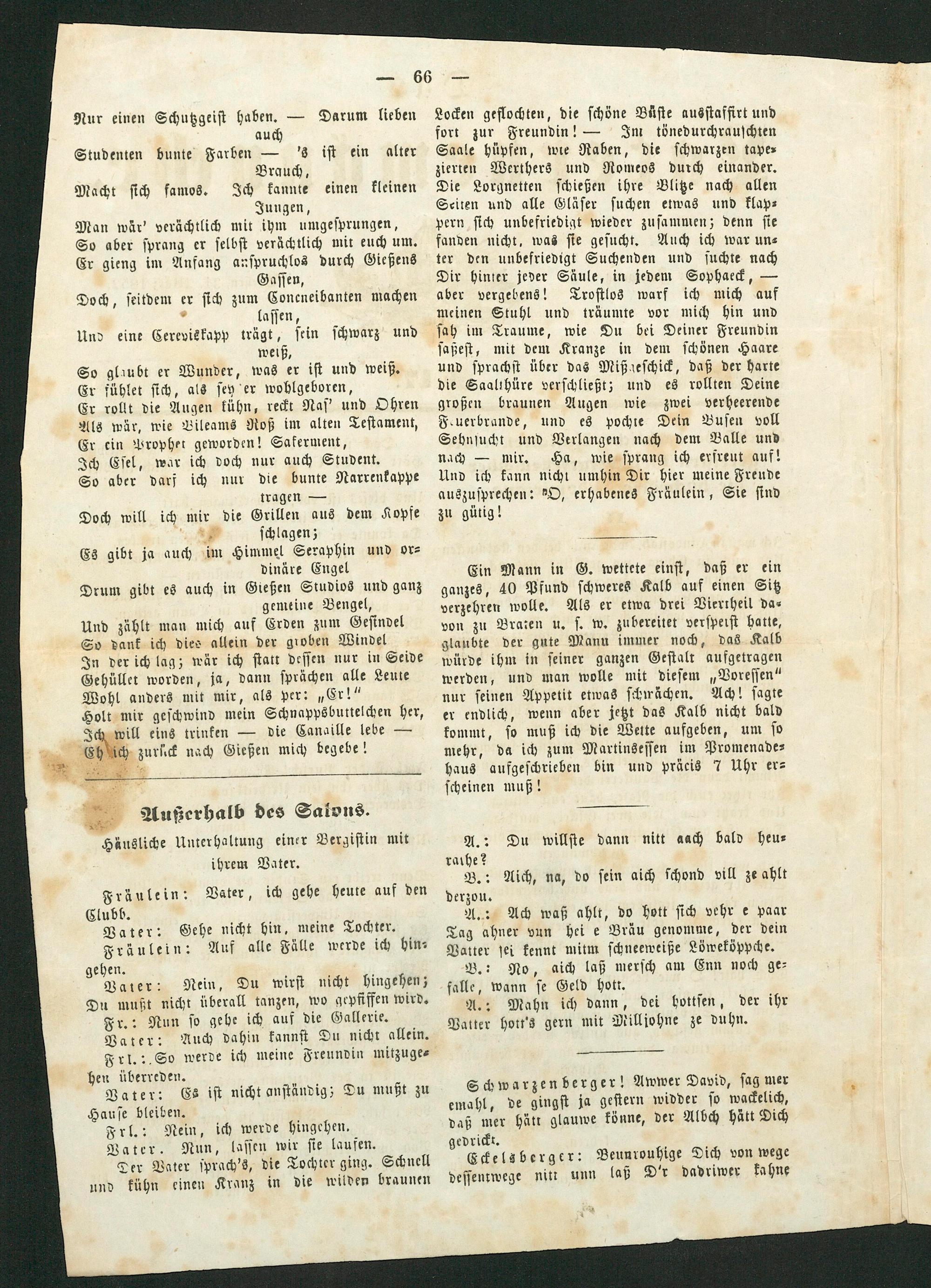 Tag ahner vun hei e Bräu genomme, der dein Vatter sei kennt mitm schneeweiße Löweköppche. B.: No, aich laß mersch am Enn noch ge⸗ falle, wann se Geld hott. A.: Mahn ich dann, dei bottsen, der ihr Vatter hott's gern mit Milliohne ze duhn.