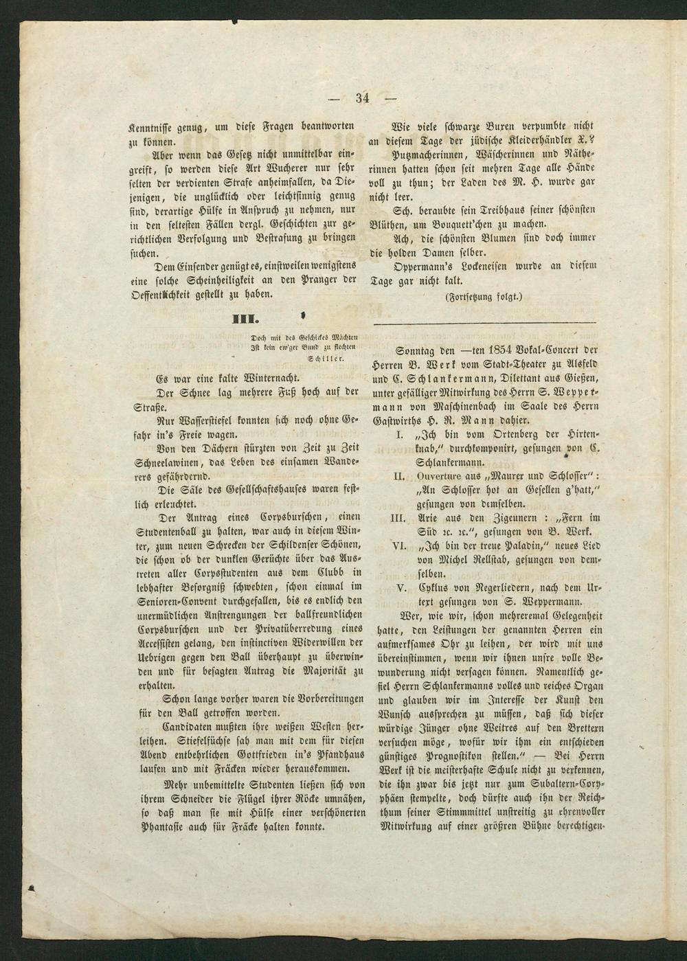 Sonntag den—ten 1854 Vokal⸗Concert der Herren B. Werk vom Stadt⸗Theater zu Alsfeld und C. Schlankermann, Dilettant aus Gießen, unter gefälliger Mitwirkung des Herrn S. Wepper⸗ mann von Maschinenbach im Saale des Herrn Gastwirths H. R. Mann dahier.