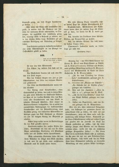 Der Antrag eines Corpsburschen, einen Studentenball zu halten, war auch in diesem Win⸗ ter, zum neuen Schrecken der Schildenser Schönen, die schon ob der dunklen Gerüchte über das Aus— treten aller Corpsstudenten aus dem Clubb in lebhafter Besorgniß schwebten, schon einmal im Senioren⸗Convent durchgefallen, bis es endlich den unermüdlichen Anstrengungen der ballfreundlichen Corpsburschen und der Privatüberredung eines Aceessisten gelang, den instinctiven Widerwillen der Uebrigen gegen den Ball überhaupt zu überwin— den und für besagten Antrag die Majorität zu erhalten. n