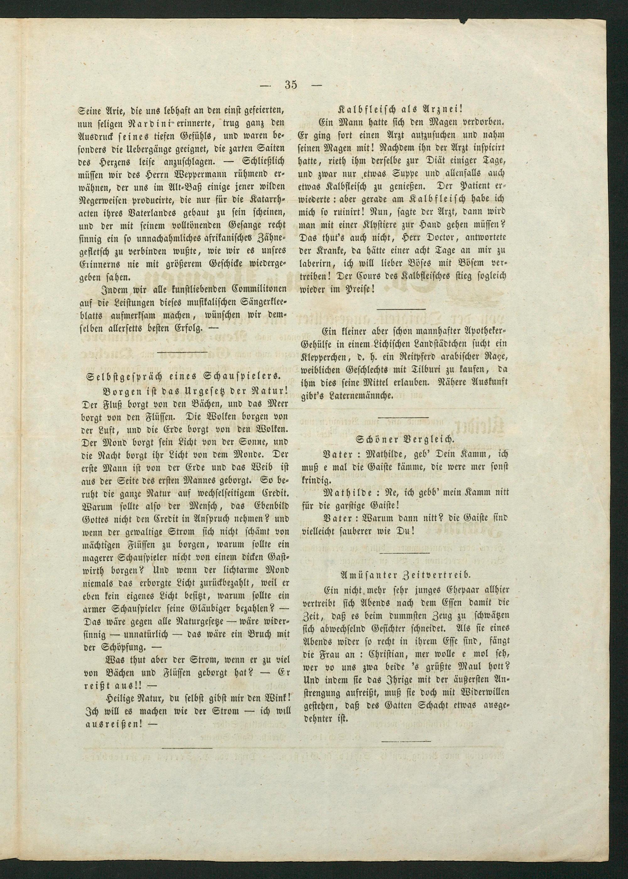 Ein Mann hatte sich den Magen verdorben. Er ging fort einen Arzt aufzusuchen und nahm seinen Magen mit! Nachdem ihn der Arzt inspicirt hatte, rieth ihm derselbe zur Diät einiger Tage, und zwar nur etwas Suppe und allenfalls auch etwas Kalbfleisch zu genießen. Der Patient er— wiederte: aber gerade am Kalbfleisch habe ich mich so ruinirt! Nun, sagte der Arzt, dann wird man mit einer Klystiere zur Hand gehen müssen? Das thut's auch nicht, Herr Doctor, antwortete der Kranke, da hätte einer acht Tage an mir zu laberirn, ich will lieber Böses mit Bösem ver— treiben! Der Cours des Kalblleisches stieg sogleich wieder im Preise!