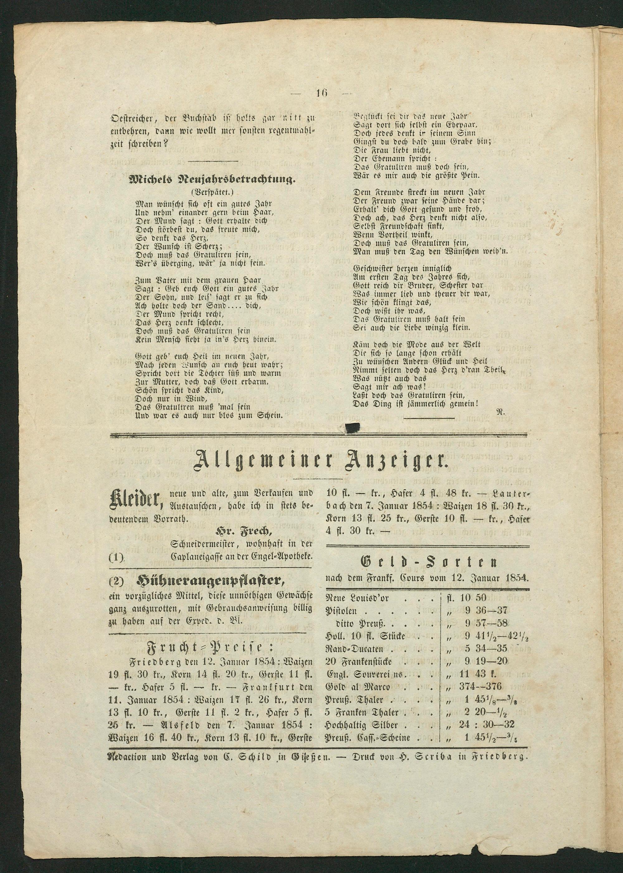 Friedberg den 12. Januar 1854: Waizen 20 Frankenstücke.„ 9 19—20 5