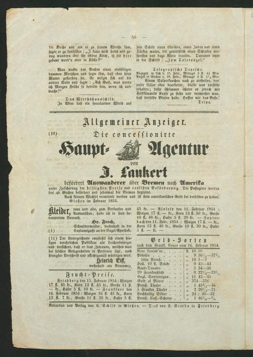 befördert Auswanderer über Bremen nach Amerika unter Zusicherung der billigsten Preise und reellsten Beförderung. Die Passagiere werden frei ab Gießen befördert und jedesmal bis Bremen begleitet. Auch können Wechsel vermittelt werden und ist stets amerikanisches Gold bei derselben zu haben. Gießen im Februar 1854.