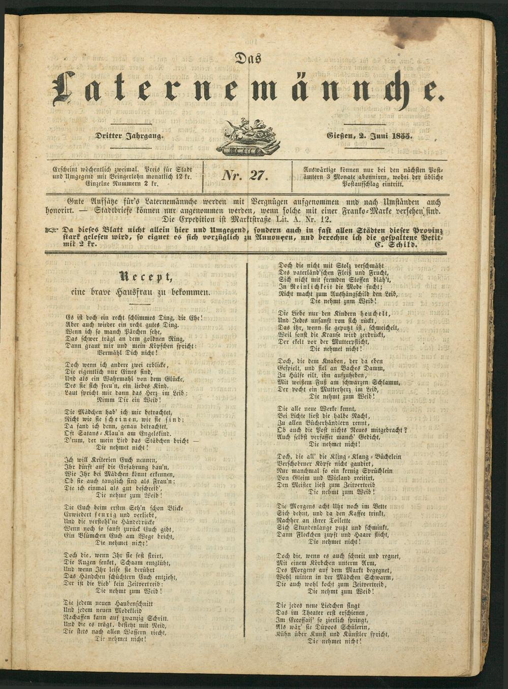 Gute Aufsätze für's Laternemännche werden mit Vergnügen aufgenommen und nach Umständen auch W— Stadtbriefe können nur angenommen werden, wenn solche mit einer Franko⸗Marke versehen sind. Die Expedition ist Marktstraße Lit. K. Nr. 12. Da dieses Blatt nicht allein hier und Umgegend, sondern auch in fast allen Städten dieser Provinz 5 wird, so eignet es sich vorzüglich zu Annoncen, und berechne ich 1 Nec ch d. Petit⸗ mi.*