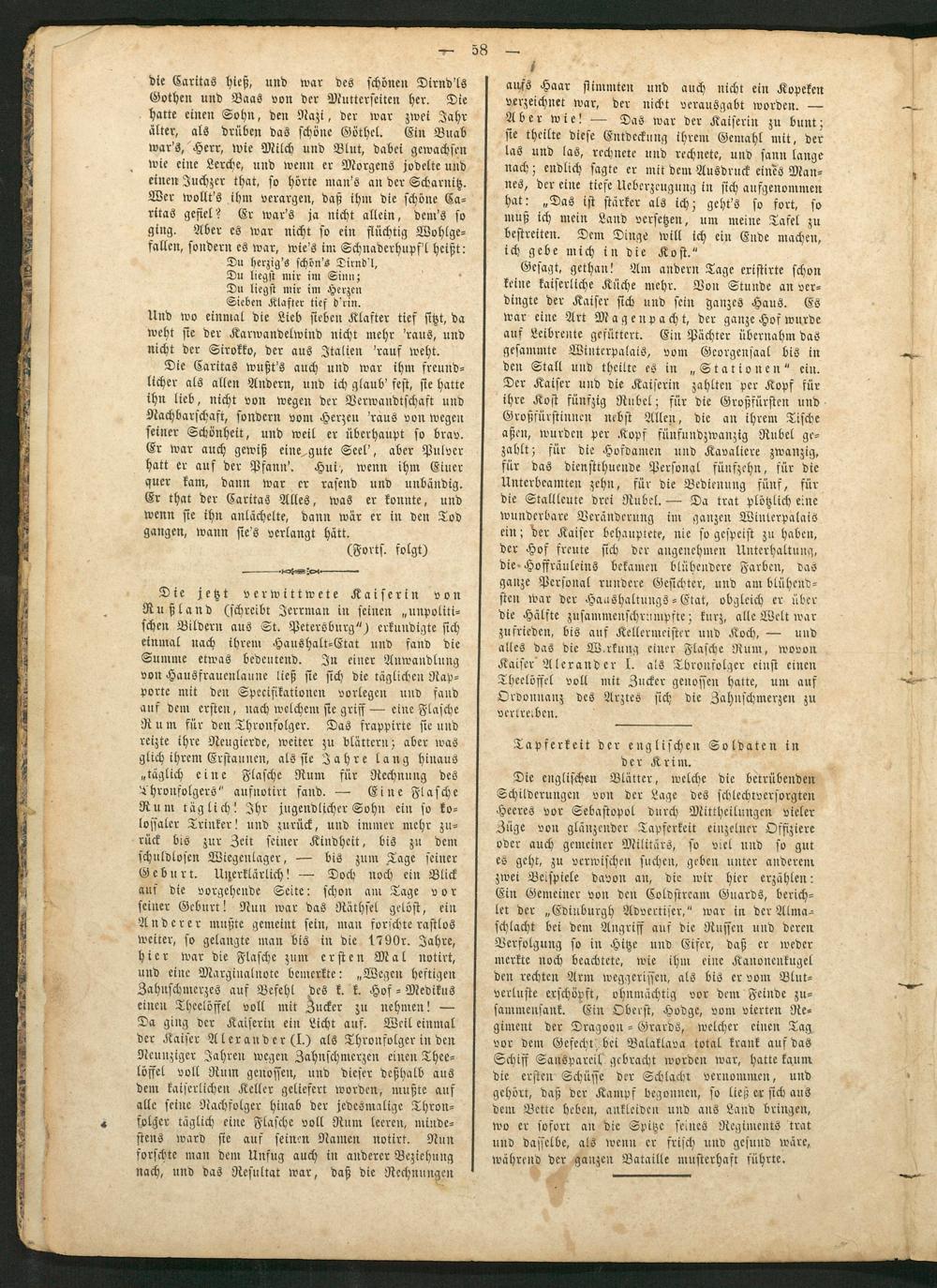 f schen Bildern aus St. Petersburg“) erkundigte sich 3 einmal nach ihrem Haushalt-Etat und fand die 5 Summe etwas bedeutend. In einer Anuwandlung 1 von Hausfrauenlaune ließ sie sich die täglichen Rap⸗ porte mit den Speeifikationen vorlegen und fand 1 auf dem ersten, nach welchem sie griff— eine Flasche 1 Rum für den Thronfolger. Das frappirte sie und . reizte ihre Neugierde, weiter zu blättern; aber was f glich ihrem Erstaunen, als sie Jahre lang hinaus „täglich eine Flasche Rum für Rechnung des Thronfolgers“ aufnotirt fand.— Eine Flasche Rum täglich! Ihr jugendlicher Sohn ein so ko— lossaler Trinker! und zurück, und immer mehr zu- rück bis zur Zeit seiner Kindheit, bis zu dem schuldlosen Wiegenlager,— bis zum Tage seiner Geburt. Unerklärlich!— Doch noch ein Blick auf die vorgehende Seite: schon am Tage vor seiner Geburt! Nun war das Räthsel gelöst, ein Anderer mußte gemeint sein, man forschte rastlos weiter, so gelangte man bis in die 1790r. Jahre, hier war die Flasche zum ersten Mal notirt, und eine Marginalnote bemerkte:„Wegen heftigen Zahnschmerzes auf Befehl des k. k. Hof- Medikus einen Theelöffel voll mit Zucker zu nehmen!— Da ging der Kaiserin ein Licht auf. Weil einmal der Kaiser Alexander(I.) als Thronfolger in den Neunziger Jahren wegen Zahnschmerzen einen Thee—