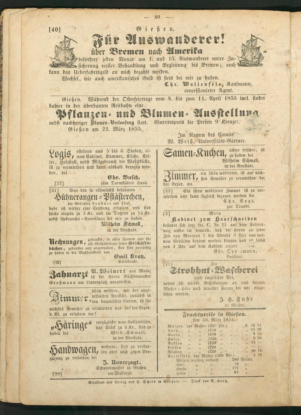 2 r sicherung reeller Behandlung und Begleitung bis Bremen; auch* kann das Ueberfahrtsgeld an mich bezahlt werden. Wechsel, wie auch amerikanisches Gold ist stets bei mir zu haben. Chr. Wallenfels, Kaufmann, „ 0 concessionirter Agent. Gießen. Während der Osterfeiertage vom 8. bis zum 11. April 1855 incl. findet dahier in der überbauten Reitbahn eine Pflanzen und Blumen⸗ Ausstellung nebst nachheriger Blumen-Verloosung statt. Eintrittspreis die Person 9 Kreuzer. 0. Gießen am 22. März 1855. l Im Namen des Comité!“ 17 W. Weiß, Universitäts⸗Gärtner. 2 8 estehend aus 5 bis 6 Stuben, ei⸗ S„K c ächter frischer, ist Lo 1 nem Cabinet, Kammer, Küche, Kel— amen⸗ I en, u haben bei 7 zu h ler, Holzstall, nebst Mitgebrauch der Waschküche, Wilhelm Schmall, ist zu vermiethen und kann alsbald bezogen wer⸗ in der Neustadt. den, bei 8 er ein schön möblirtes, ist auf näch⸗ Chr. Busch, Zimmer stes Srwste zu vermiethen bei 1324 zum Darmstädter Haus. der Erped. wo. 1474 Von den so rühmlichst bekannten 1334 Ein schön möblirtes Zimmer ist zu ver⸗ 4 Hühneraugen⸗ Pflästerchen, miethen und kann sogleich bezogen werden bei der Gebrüder Lendnee aus Tirol, Cher. Vogt, habe ich wieder eine Sendung erhalten und sind zur Traube. solche einzeln zu 5 Kr. und im Dutzend zu 54 Kr. 30 Mein nebst Gebrauchs ⸗Anweisung bet mir zu haben. Kabinet zum Haarschneiden 1 Wilhelm Schmall, befindet sich jetzt Lit. C. Nr. 25 auf dem Selters⸗ in der Neustadt. weg, wobei ich bemerke, daß die Herrn zu jeder 5 geben ð•‚ß Zeit von Morgens 7 bis Abends 9 Uhr von mei⸗ 5 Rechnungen, alle Geschafte erte sowie Gef schäfts⸗ nem Gehülfen bedient werden können und ich eelbst bücher, gebunden und ungebunden, sind stets vorräthig von 3 Uhr auf dem Kabinet e elt. zu haben in der Buchdruckerei von Chr. Oppsemann, Emil Kratz, 9 j221 Schulstraße. 7581 3155 8 e 5 S 2 ed 2 Zahnarzt M. Weine ert. aus Mainz. roh hut Wa 90 herei ist 115 5 wüchsennaer nach englischer Art, Großmann am Lindenplatz anzutreffen. nehme ich wieder Bestellungen an und können A schön möblirt, mit der ange⸗ Muster⸗Hüte nach neuester Façon bei mir einge⸗ 3 sehen werden. 4 gie nehmsten Aussicht, zunächst in seh 2 f i miner„den botanischen Garten, ist für J. H. Fuhr 1 5 0 l in Gießen nächstes Semester zu vermiethen und auf der Exped. in Gießen. 5 9 7 b. 9——*. 7„ dee d. Bl. zu erfahren wo? Fruchtpreise in Giesien. A* vorzügliche neue Holländische, Am 30. März 1855. 0 7 aringe das Stück zu 4 Kr., sind zu Waizen, das Malter(200 Pfö J 15 91 ö haben bei Wilh. Schmal, BF in der Neustadt. Safer,, FFF Erbsen„„ e andwa en mehrere, sind zu verkau⸗ Lien;, N fen oder auch gegen Ver⸗ Wicken„(220 19 8 8 ung zu verleihen bei Kartoffeln, das Malter 200 un„ ö gutung z l J Uuve rzagt, Waitzen wurden verkauft. 280 Malter. 75 8 Schmiedmeister in Gießen Get 1 5 i 155 1 291 am Wallthor. Hafer 5 5„ 8 Redaktion und Verlag von C. Schild in Gießen.— Druck von E. Kratz. 5