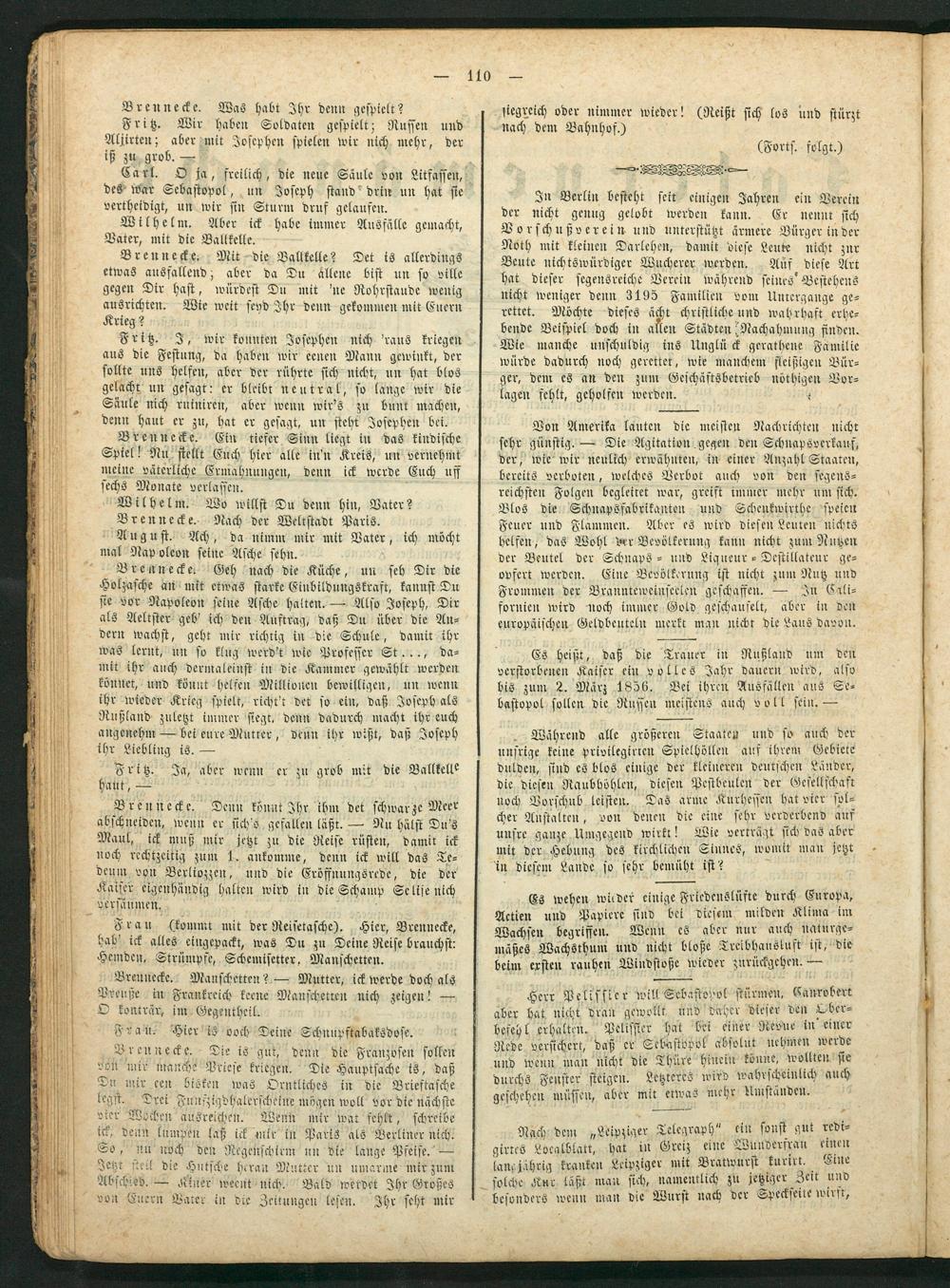 Brennecke. Denn könnt Ihr ihm det schwar ze Meer abschneiden, wenn er sich's gefallen läßt.— Nu hälst Du's Maul, ick muß mir jetzt zu die Reise rüsten, damit ick noch rechtzeitig zum 1. ankomme, denn ick will das Te— deum von Berliozzen, und die Eröffnungsrede, die der Kaiser eigenhändig halten wird in die Schamp Se lise nich versäumen. 5