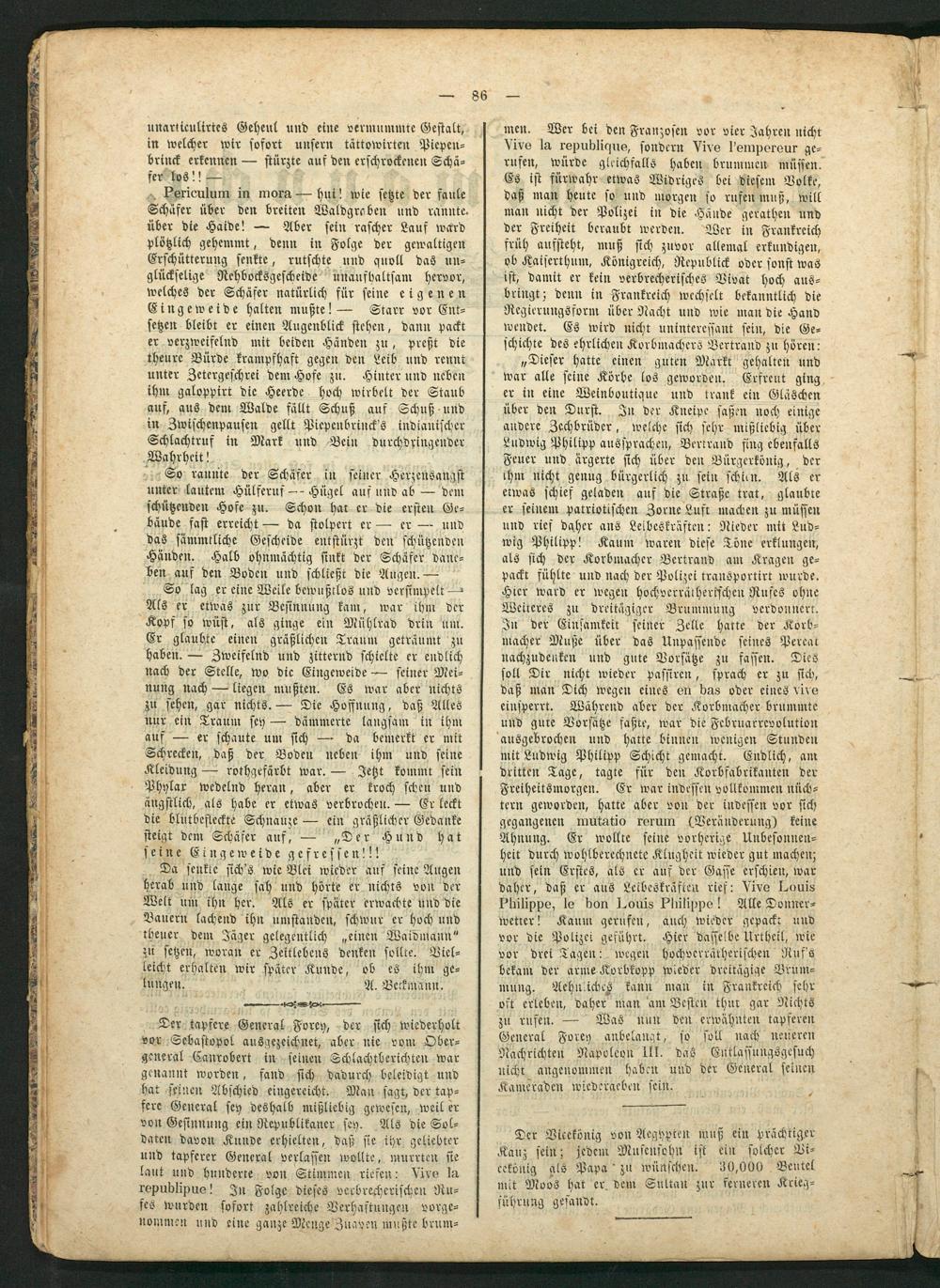 „Dieser hatte einen guten Markt gehalten und war alle seine Körbe los geworden. Erfreut ging er in eine Weinboutique und trank ein Gläschen über den Durst. In der Kneipe saßen noch einige andere Zechbrüder, welche sich sehr mißliebig über Ludwig Philipp aussprachen, Bertrand fing ebenfalls Feuer und ärgerte sich über den Bürgerkönig, der ihm nicht genug bürgerlich zu sein schien. Als er etwas schief geladen auf die Straße trat, glaubte er seinem patriotischen Zorne Luft machen zu müssen und rief daher ans Leibeskräften: Nieder mit Lud⸗ wig Philipp! Kaum waren diese Töne erklungen, als sich der Korbmacher Bertrand am Kragen ge— packt fühlte und nach der Polizei transportirt wurde. Hier ward er wegen hochverrätherkischen Rufes ohne Weiteres zu dreitaͤgiger Brummung verdonnert. In der Einsamkeit seiner Zelle hatte der Korb- macher Muße über das Unpassende seines Pereat nachzudenken und gute Vorsätze zu fassen. Dies soll Dir nicht wieder passtren, sprach er zu sich, daß man Dich wegen eines en bas oder eines vive einsperrt. Während aber der Korbmacher brummte und gute Vorsätze faßte, war die Februarrevolution