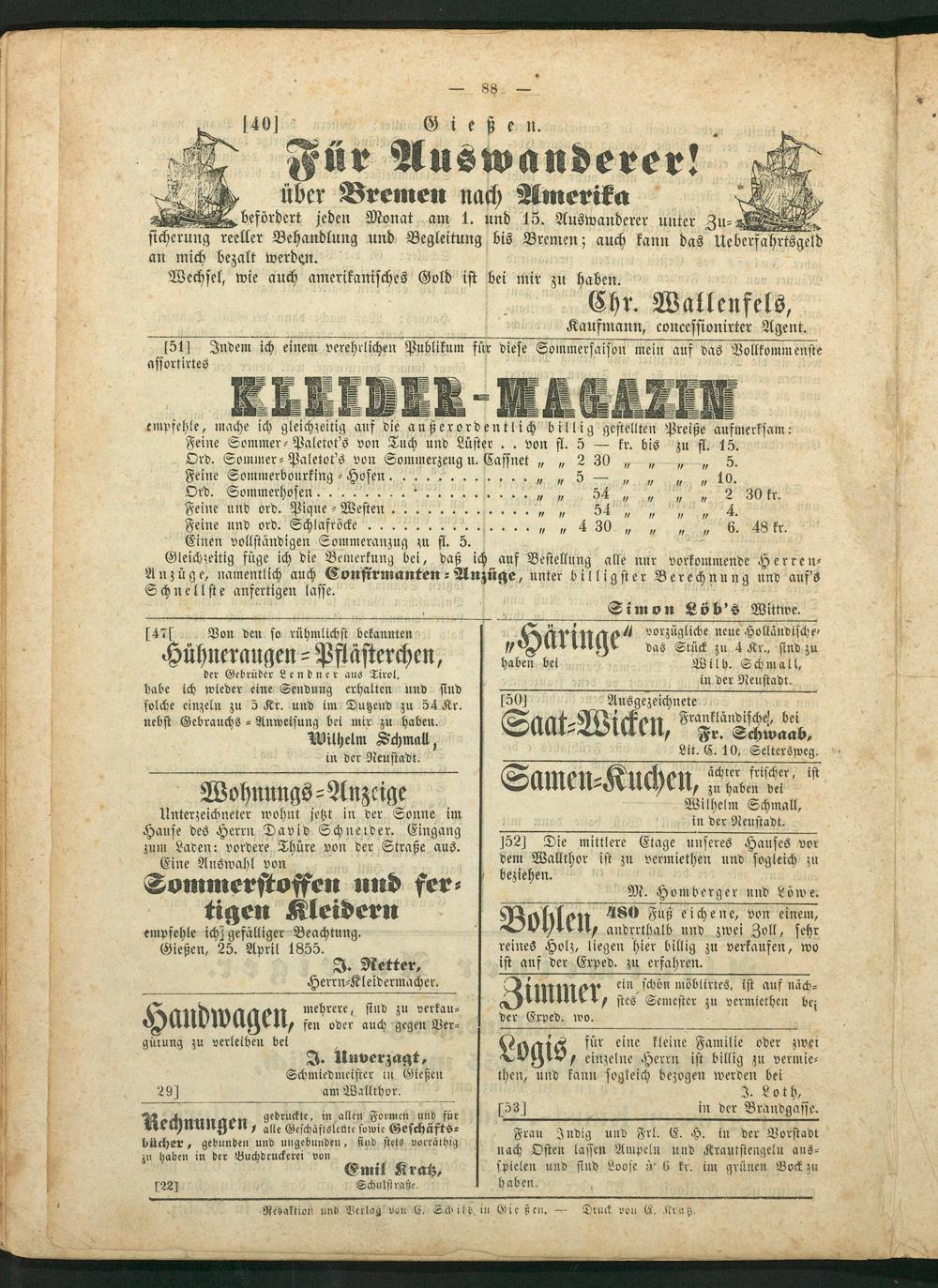 Gießen, 25. April 1855. 3 e 55 0 5 zu verkaufen, wo 55 etter, ist auf der Exped. zu erfahren. Herrn-Kleidermacher. ö„ein schön möblirtes, ist auf näch⸗ . i immer, stes Semester zu vermiethen bei d mehrere, sind zu verkau⸗ Re b Han wagen, fen oder auch gegen Ver⸗ 3 guͤtung zu verleihen bei 5 Lo is für eine kleine Familie oder zwei J. Unverzagt, 1/ einzelne Herrn ist billig zu vermie— Schmiedmeister in Gießen then, und kann sogleich bezogen werden bei 29] am Wallthor. a J. Loth, 1 ch 1 en gedruckte, in allen Formen und für 0 in der Braudgasse. echnungen, alle Geschaftsleate sowie Geschäftse] Frau Indig und Frl. C. H. in der Vorstabt