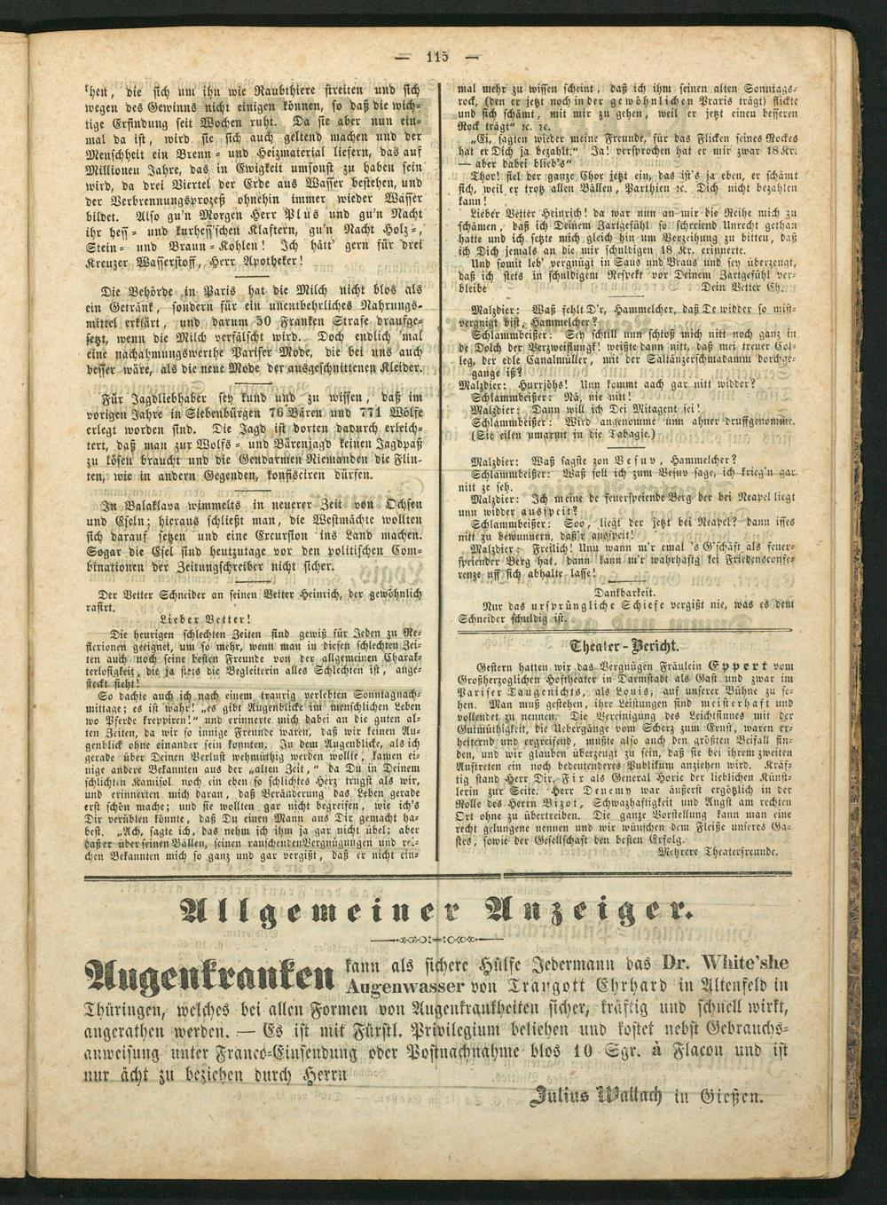 Gestern hatten wir das Vergnügen Fräulein Eppert vom Großherzoglichen Hoftheater in Darmstadt als Gast und zwar im Pariser Taugenichts, als Louis, auf unserer Bühne zu se⸗ hen. Man muß gestehen, ihre Leistungen sind meisterhaft und vollendet zu nennen. Die Vereinigung des Leichtsinnes mit der Gutmüthigkeit, die Uebergänge vom Scherz zum Ernst, waren er⸗ heiternd und ergreifend, mußte also auch den größten Beifall fin⸗ den, und wir glauben überzeugt zu sein, daß sie bei ihrem zweiten Auftreten ein noch bedeutenderes Publikum anziehen wird. Kräf⸗ tig stand Herr Dir. Fix als General Horie der lieblichen Künst⸗ lerin zur Seite. Herr Denemy war äußerst ergötzlich in der Rolle des Herrn Bizot, Schwazhaftigkeit und Angst am rechten Ort ohne zu übertreiben. Die ganze Vorstellung kann man eine recht gelungene nennen und wir wünschen dem Fleiße unseres Ga⸗ stes, sowie der Gesellschaft den besten Erfolg.