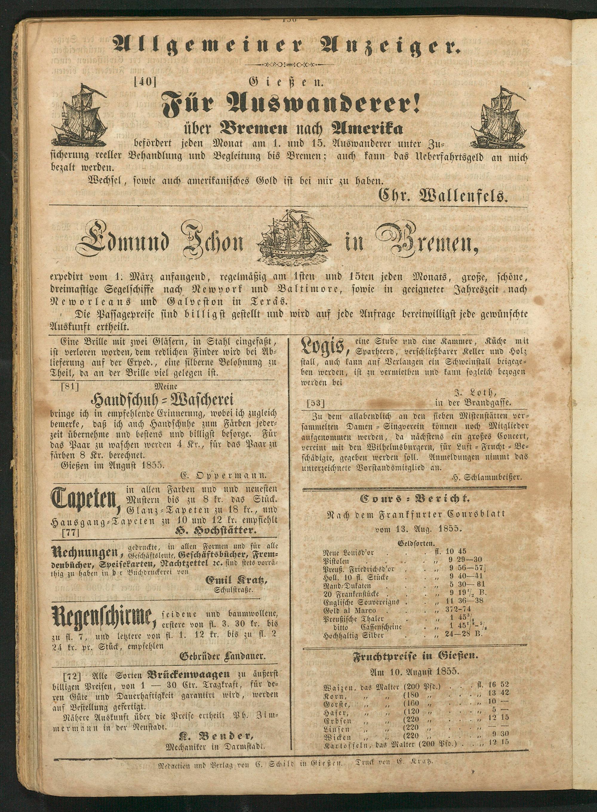 Fruchtpreise in Giesen. Am 10. August 1855.