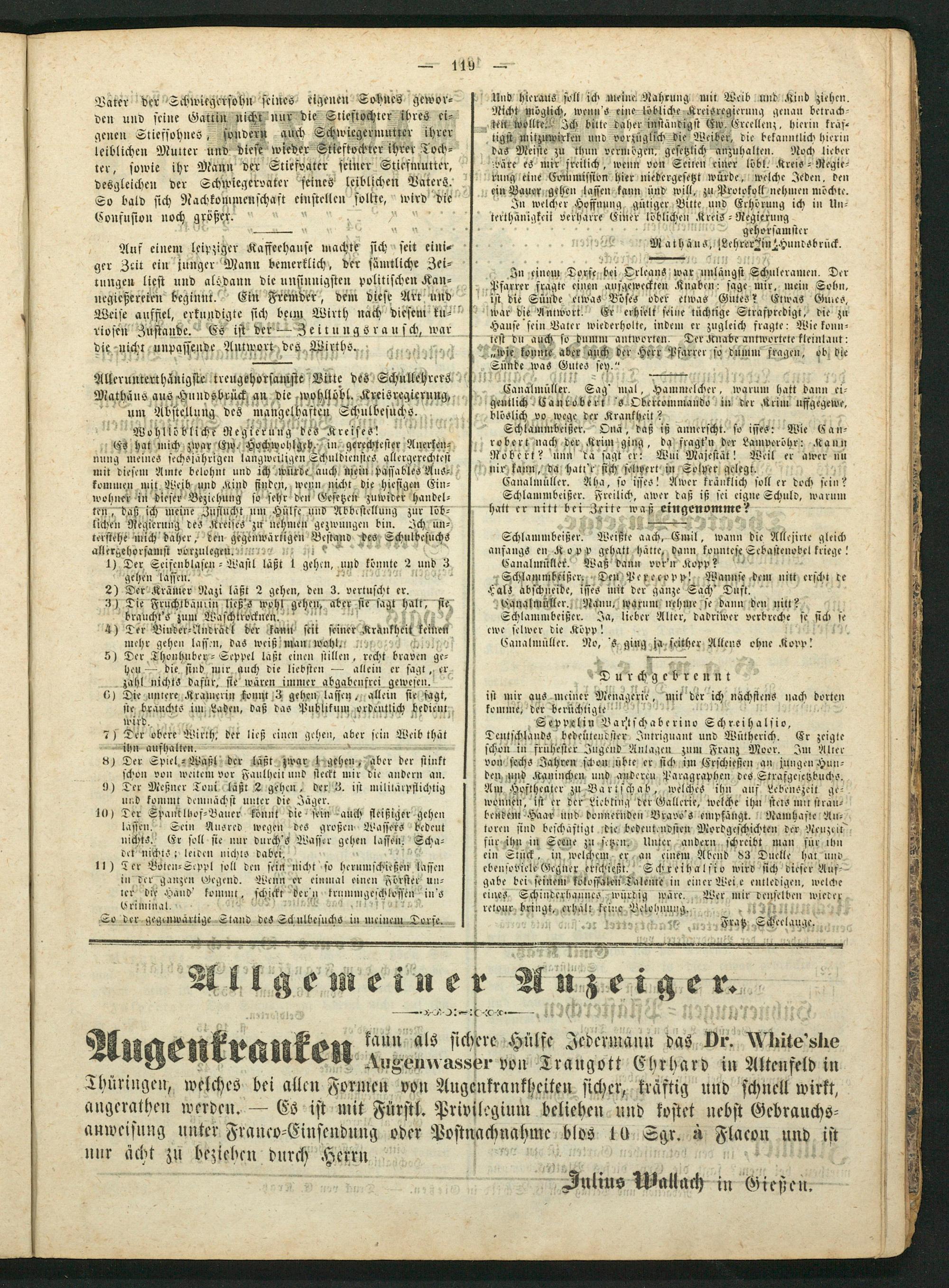 Es hat mich zwar Ew. Hochwohlgeh. in, gerechtester Anerken⸗ nung meines sechsjährigen langweiligen Schuldienstes allergerechtest mit diesem Amte belohnt und ich würde, auch mein passables Aus⸗ kommen mit, Weib und Kind finden, wenn, nicht die hiesigen Ein⸗ 17 5 in dieser Beziehung so sehr den G esetzen zuwider handel⸗ ten, daß ich meine Zuflucht um Hülfe und Abbestellung zur löb⸗ lichen Regierung des Kreises zu nehmen gezwungen bin. Ich ün— terstehe mich daher, den e 5 des Schulbesuchs allerzehorsanist vorzulegen.“
