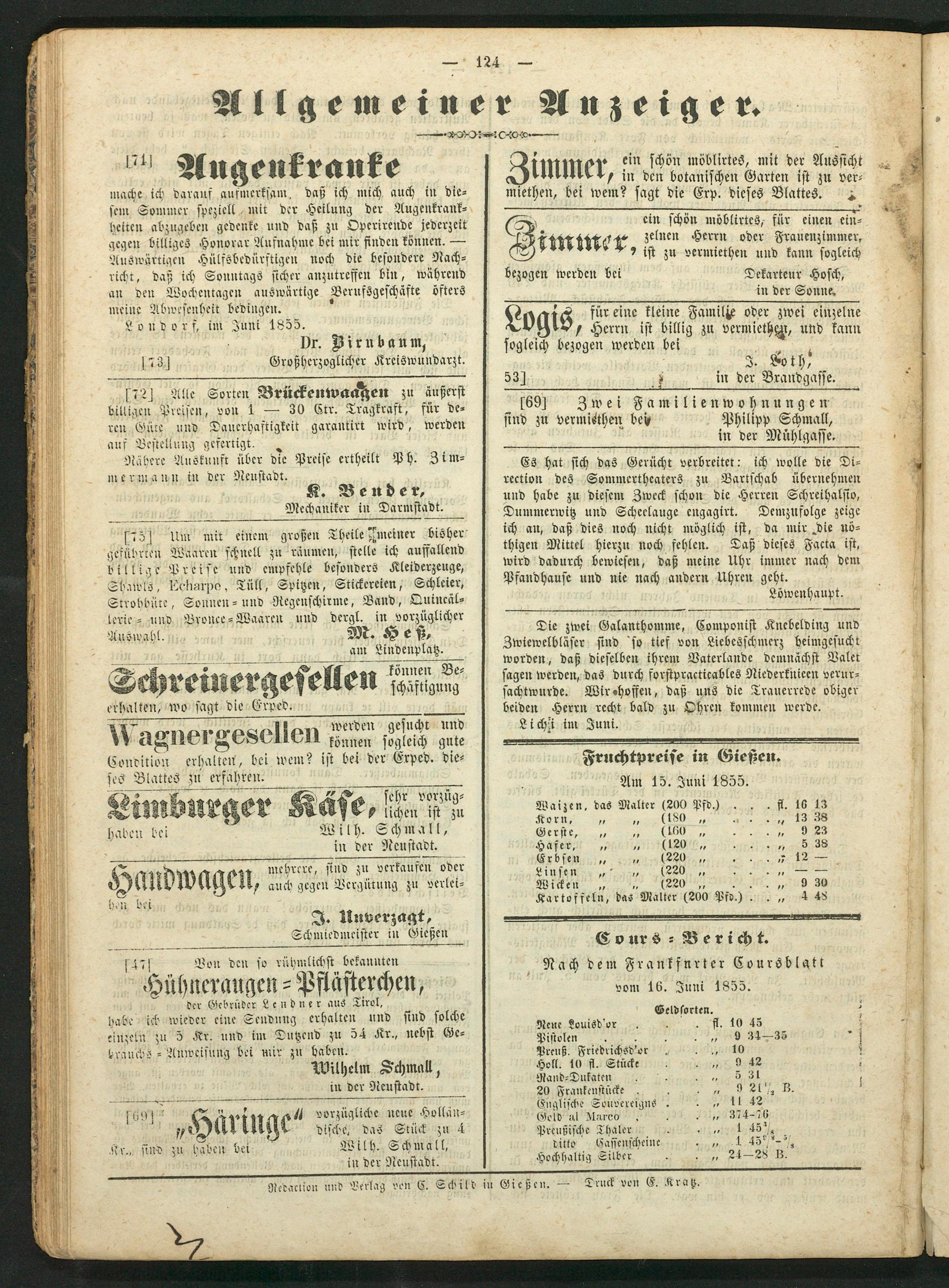 sehr vorzüg⸗ 5. Limburger Käse, 1 5 ist 11 Waizen, das Malter 80 Pfd.) fl. 16 13 Korn, 1„(o„ 0 bei Wilh. Schmall, e b in der Neustadt. Häfen„e ee,. 225 877775 8 Erbsen, 15 280 5„ H andwa en mehrere, sind zu verkaufen oder 1 4 0 9290 1 8 e 0/ auch gegen Vergütung zu verlei⸗ Wicken„(220„ 9 0 hen bei Kartoffeln, das Malter 200 Pfd.)„ 448 285 Unve rzagt, P—ñ—ßr—u—u!v—.. ͤ——. Sch 1e eister i Hieße N 2 8 chmiedmeister in Gießen Cours Bericht. 47 Von den so 1 bekannten Nach dem Frankfurter Coursblatt 25 0 Hühneraugen Pflästerchen, vom 16. Juni 1855 der Gebrüder Lendner aus Tirol, 4 1 0 ch ö 0 habe ich wieder eine. erhalten 8 1 e. 10 45 ö einzeln zu 5 Kr. und im Dutzend zu 54 Kr., nebst Ge— Pistolen. a 3% 40 344 35— brauchs-Anweisung bei mir zu haben. Preuß. Friedrichsd' W eee 4 Wilhelm Schmall, 1 85 1 Süuke and-Dukaten 752. 9„ 5 in der Neustadt. 20 Frankenstücke a„ l . 5 Englische Souvereigns. e 42 1 Här inge 2 e eee eee d e bah e e, ee 7 dische, das Stück zu 4 Preußische Thaler 85 38471345 ½% 5 Kr., sind zu haben bei Wilh. Schmall, dbitto Cassenscheine 11679651 455. in der Neustadt. Hochhaltig Silber 5„ 2