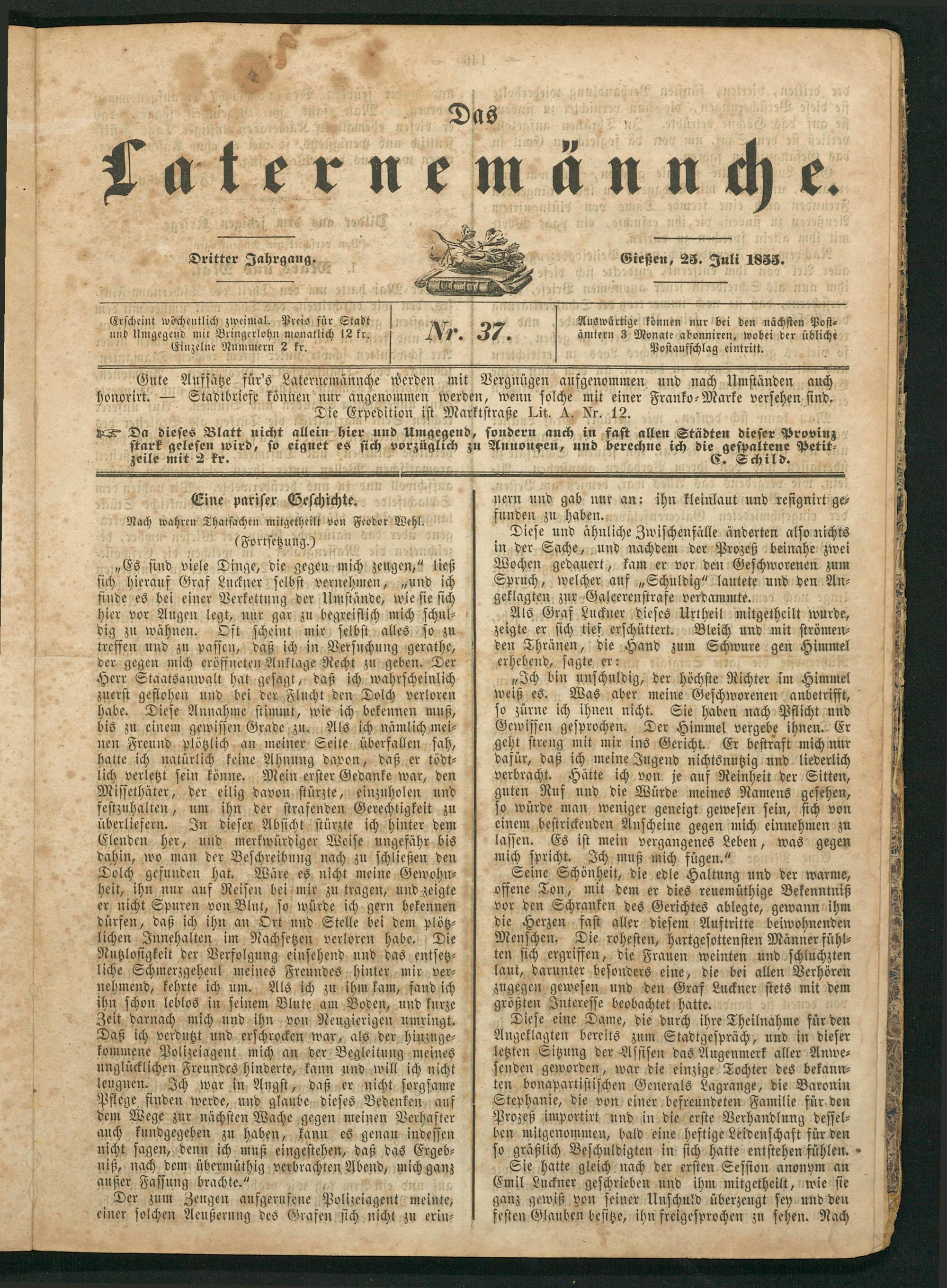 Gute Aufsätze für's Laternemännche werden mit Vergnügen aufgenommen und nach Umständen auch honorirt.— Stadtbriefe können nur angenommen werden, wenn solche mit einer Franko-Marke versehen sind.