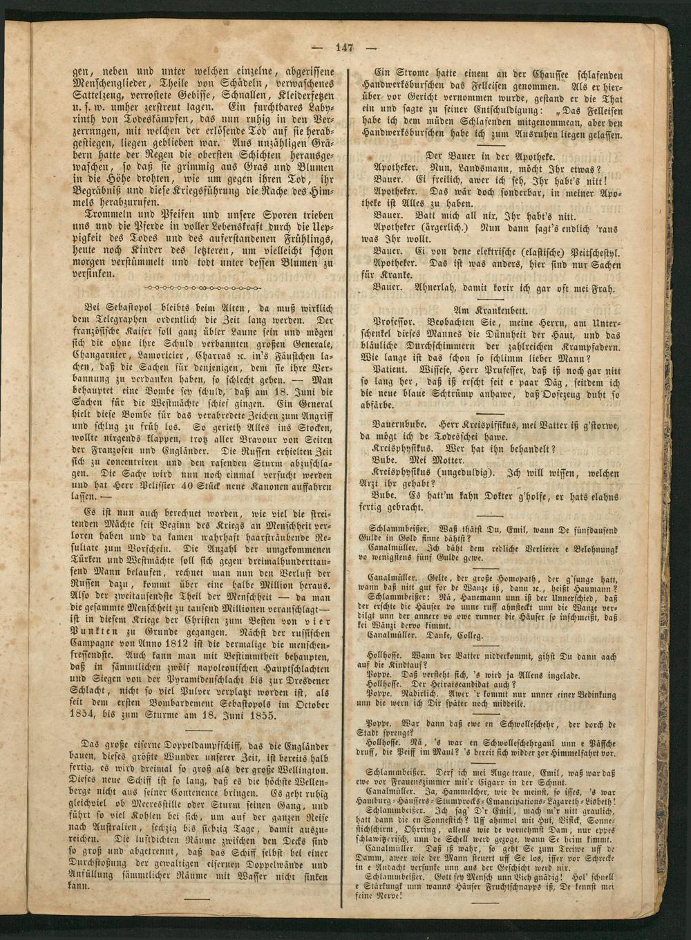 Es ist nun auch berechnet worden, wie viel die strei⸗ tenden Mächte seit Beginn des Kriegs an Menschheit ver⸗ loren haben und da kamen wahrhaft haarsträubende Re⸗ sultate zum Vorschein. Die Anzahl der umgekommenen Türken und Westmächte soll sich gegen dreimalhunderttau— send Mann belaufen, rechnet man nun den Verlust der Russen dazu, kommt über eine halbe Million heraus. Also der zweitausendste Theil der Menschheit— da man die gesammte Menschheit zu tausend Millionen veranschlagt— ist in diesem Kriege der Christen zum Besten von vier Punkten zu Grunde gegangen. Naͤchst der russischen Campagne von Anno 1812 ist die dermalige die menschen⸗ fressendste. Auch kann man mit Bestimmtheit behaupten, daß in sämmtlichen zwölf napoleonischen Hauptschlachten und Siegen von der Pyramidenschlacht bis zur Dresdener Schlacht, nicht so viel Pulver verplatzt worden ist, als seit dem ersten Bombardement Sebastopols im October 1854, bis zum Sturme am 18. Juni 1855.