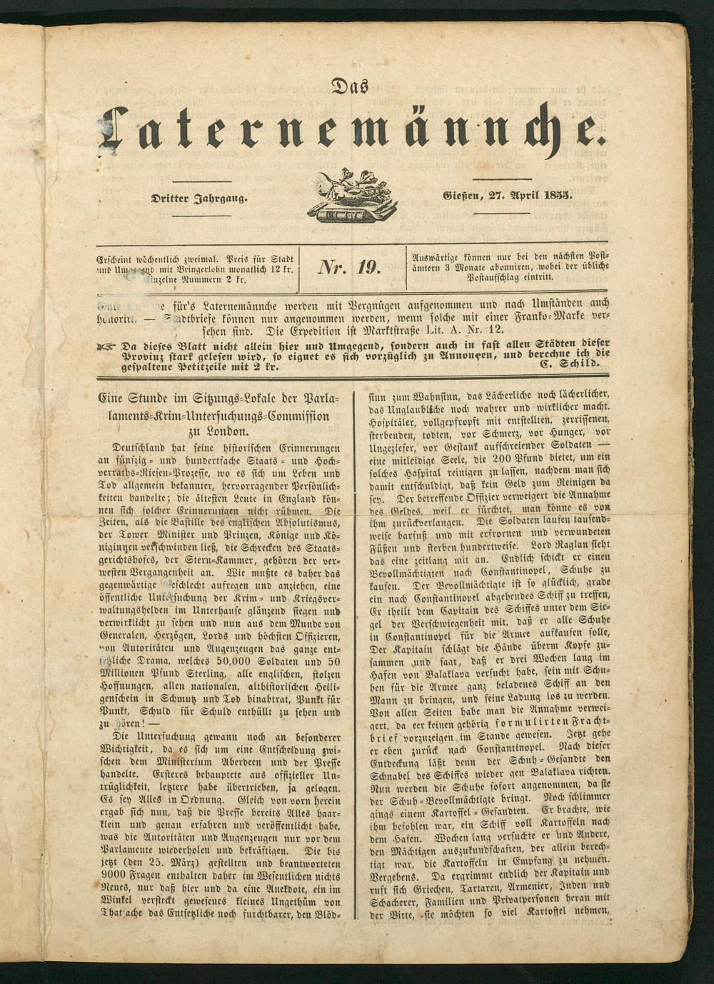 gert, da eer keinen gehörig for mu lürten Gra ch t⸗ brief vorzuzeigen im Stande gewesen. Jetzt gehe er eben zurück nach Constantinopel. Nach dieser Entdeckung läßt denn der Schuh⸗Gesandte den Schnabel des Schiffes wieder gen Balaklava richten. Nun werden die Schuhe sofort angenommen, da sie der Schuh- Bevollmächtigte bringt. Noch schlimmer gings einem Kartoffel ⸗ Gesandten. Er brachte, wie ihm befohlen war, ein Schiff voll Kartoffeln nach dem Hafen. Wochen lang versuchte er und Andere, den Mächtigen auszukundschaften, der allein berech⸗ tigt war, die Kartoffeln in Empfang, zu nehmen. Vergebens. Da ergrimmt endlich der Kapitaln und ruft sich Griechen, Tartaren, Armenier, Juden und Schacherer, Familien und Privatpersonen heran mit der Bitte, sie möchten so viel Kartoffel nehmen,