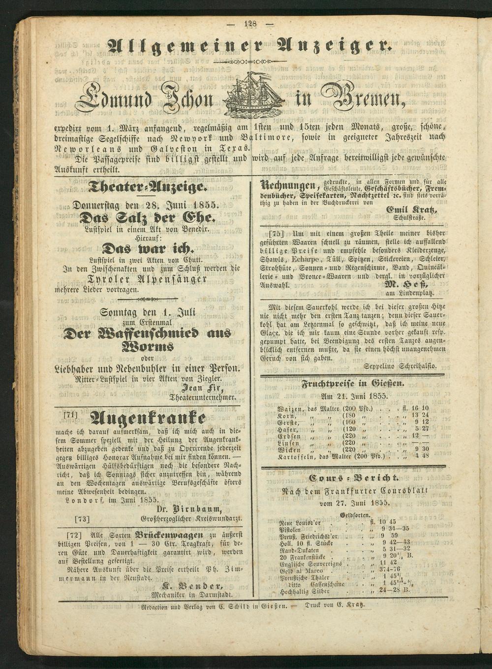 dreimastige Segelschiffe nach Newyork und Baltimore, sowie in geeigneter Jahreszeit nach Ne worleans und Galveston in Texas. Die Passagepreise sind ire gestellt und wird auf jede Aufrage bereitwilligst jede gewünschte