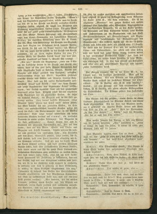 sich über die großen englischen und amerikanischen Zeitun⸗ gen, obgleich sie gegen die Pekingzeitung, deren Redacteur der Kaiser selbst ist, sehr klein erscheinen. Sie ist der allgemeine„Moniteur“ des ganzen Reiches und enthält jedesmal eine Uebersicht aller öffentlichen Angelegenheiten und merkwürdigen Ereignisse, die an den Kaiser gerichte⸗ ten Petitionen und seine Antworten darauf, seine Befehle und Instructionen an die Mandarinen und das Volk, Gerichtsentscheidungen mit Verurtheilungen und Begna⸗ digungen und Inhaltsangabe der Berhandlungen des Staatsrathes. Sie erscheint täglich auf 60 bis 70 Folio⸗ Seiten und kostet nicht mehr als jährlich etwa 12 Franks. So theilt uns der Franzose Hue mit, der merkwürdigste China- und Thibetreisende, der allein und ohne Schutz nicht nur durch das ganze China drang, sondern mitten in das verschlossene Priesterreich Thibet, das Land des Dalai-Lama, der bisher keinen Fremden in seine Myste⸗ rien eindringen ließ. Le Hue kam überall mit Schlauheit noch öfter aber mit unverschaͤmter Courage und imponi⸗ render Tollkühnheit durch.